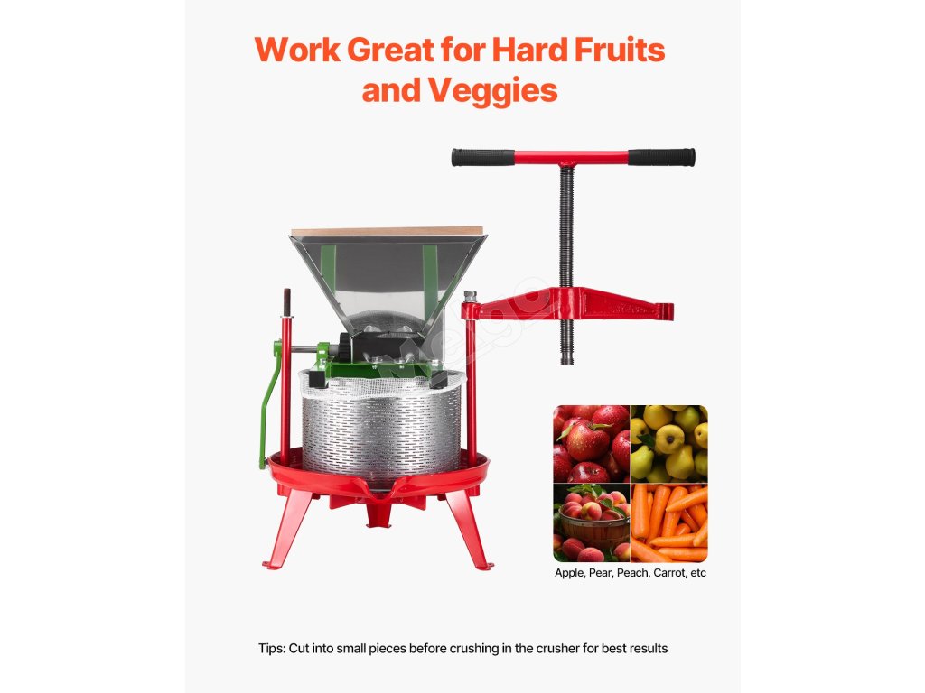 Tento drvič ovocia a jabĺk s veľkou kapacitou 7 l/1,8 galónu zvládne naraz veľkú dávku ovocia. Na dosiahnutie optimálneho výkonu nakrájajte ovocie pred drvením na menšie kúsky.