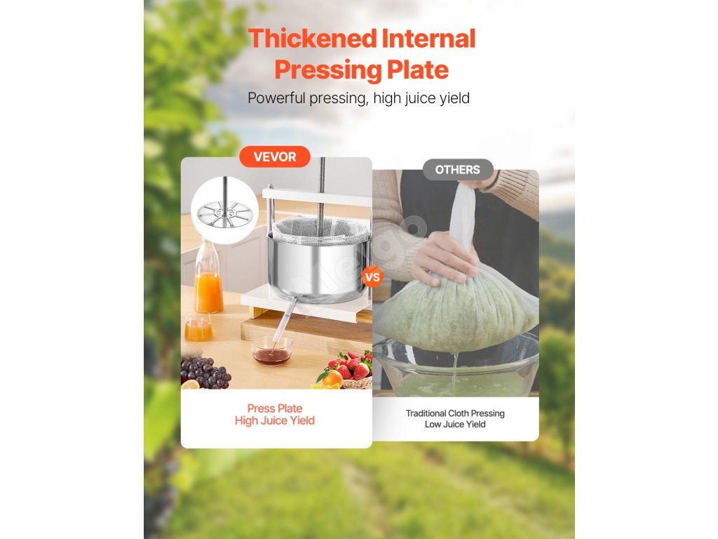 Zahustená lisovacia doska z nehrdzavejúcej ocele zabezpečuje dôkladnejšie lisovanie, účinnú extrakciu a rýchly výstup šťavy. Veľkokapacitná konštrukcia s objemom 12 l/3,17 galónov poskytuje stále čerstvú šťavu.