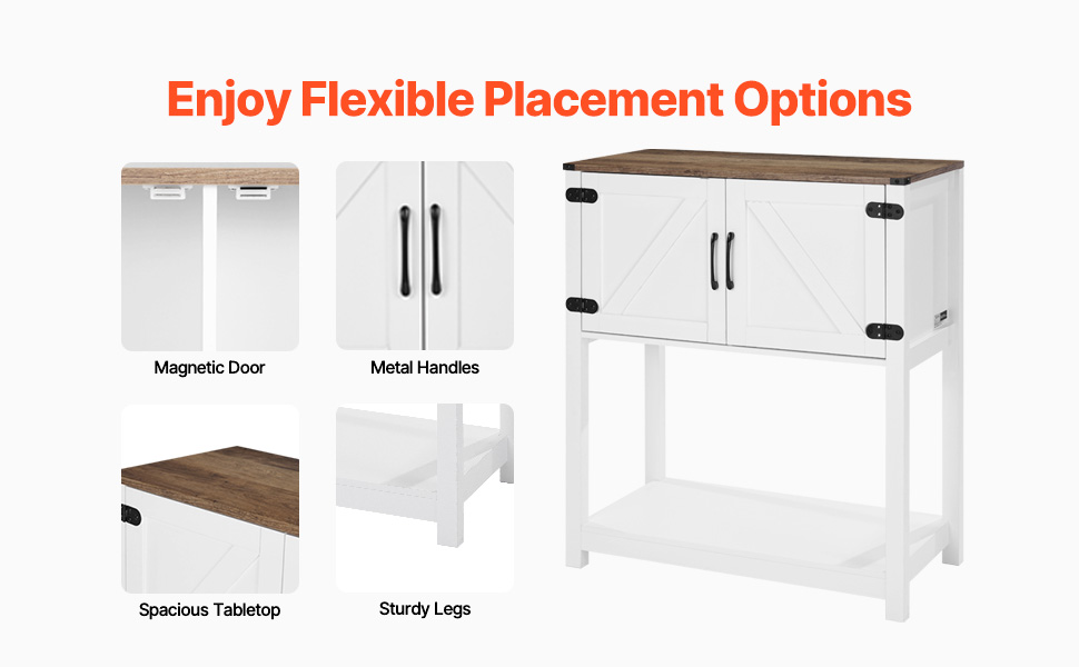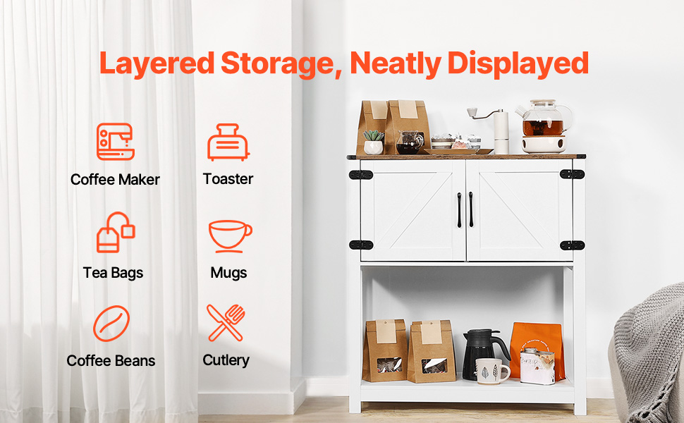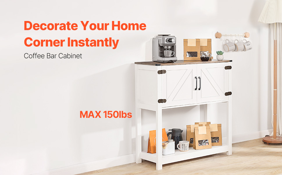 Táto farmárska barová skrinka ponúka viacúrovňový úložný priestor na kávové náradie, riad a malé spotrebiče. Je vyrobená z vysokokvalitných materiálov, má magnetické dvierka a kovové úchyty pre väčšiu eleganciu. Jednoduchá montáž so zariadením proti prevráteniu na zabezpečenie stability.