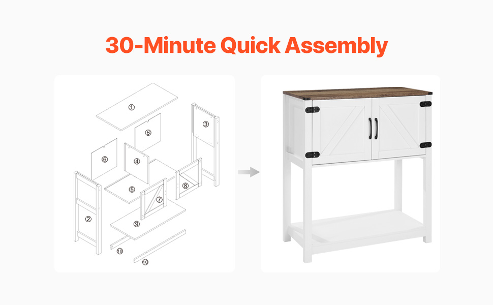Jasný návod zabezpečuje jednoduchú montáž, pričom zostavenie tejto príručnej bufetovej skrinky trvá len približne 30 minút.