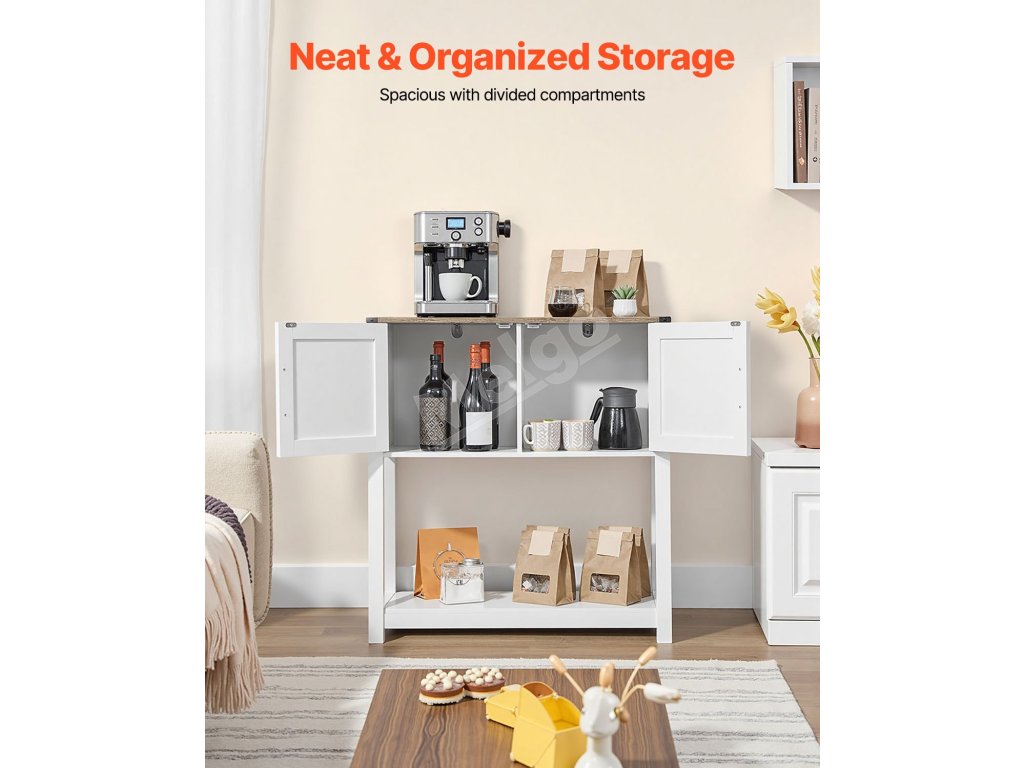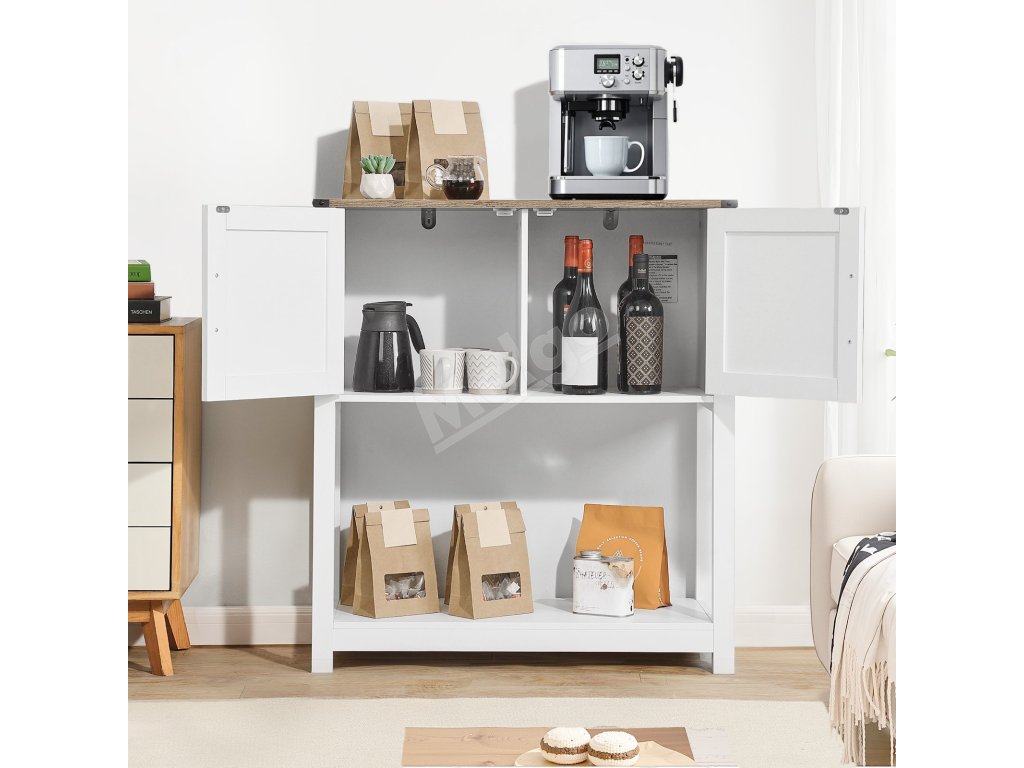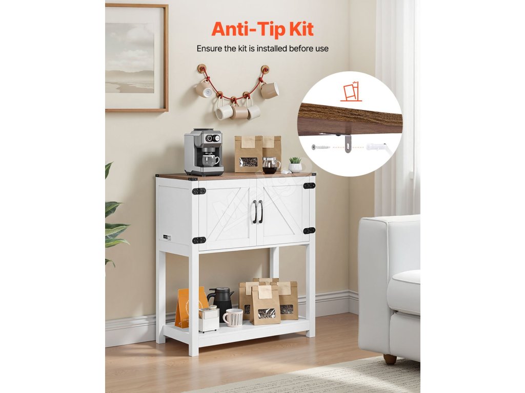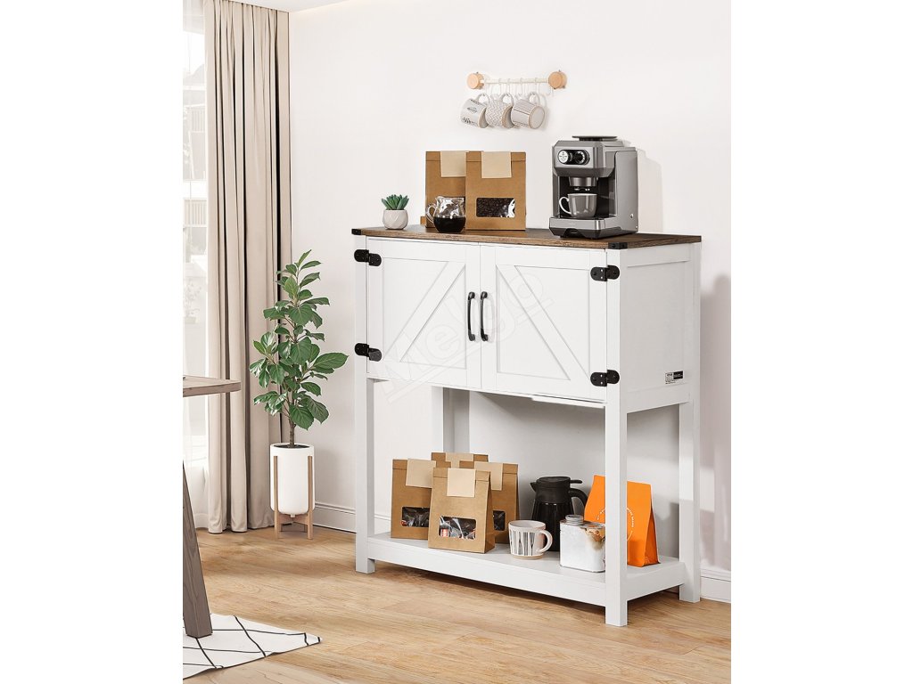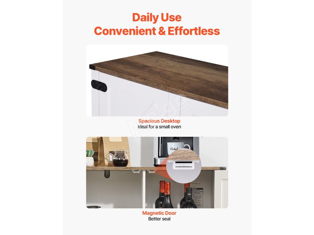 Táto farmárska barová skrinka ponúka viacúrovňový úložný priestor na kávové náradie, riad a malé spotrebiče. Je vyrobená z vysokokvalitných materiálov, má magnetické dvierka a kovové úchyty pre väčšiu eleganciu. Jednoduchá montáž so zariadením proti prevráteniu na zabezpečenie stability.
