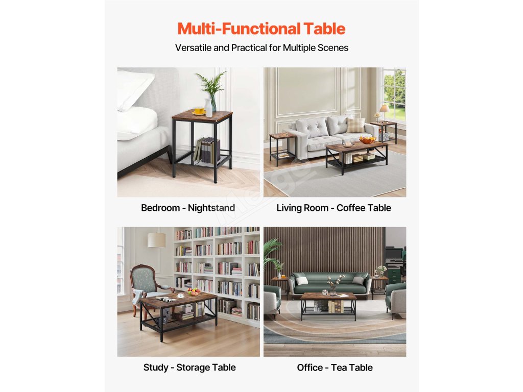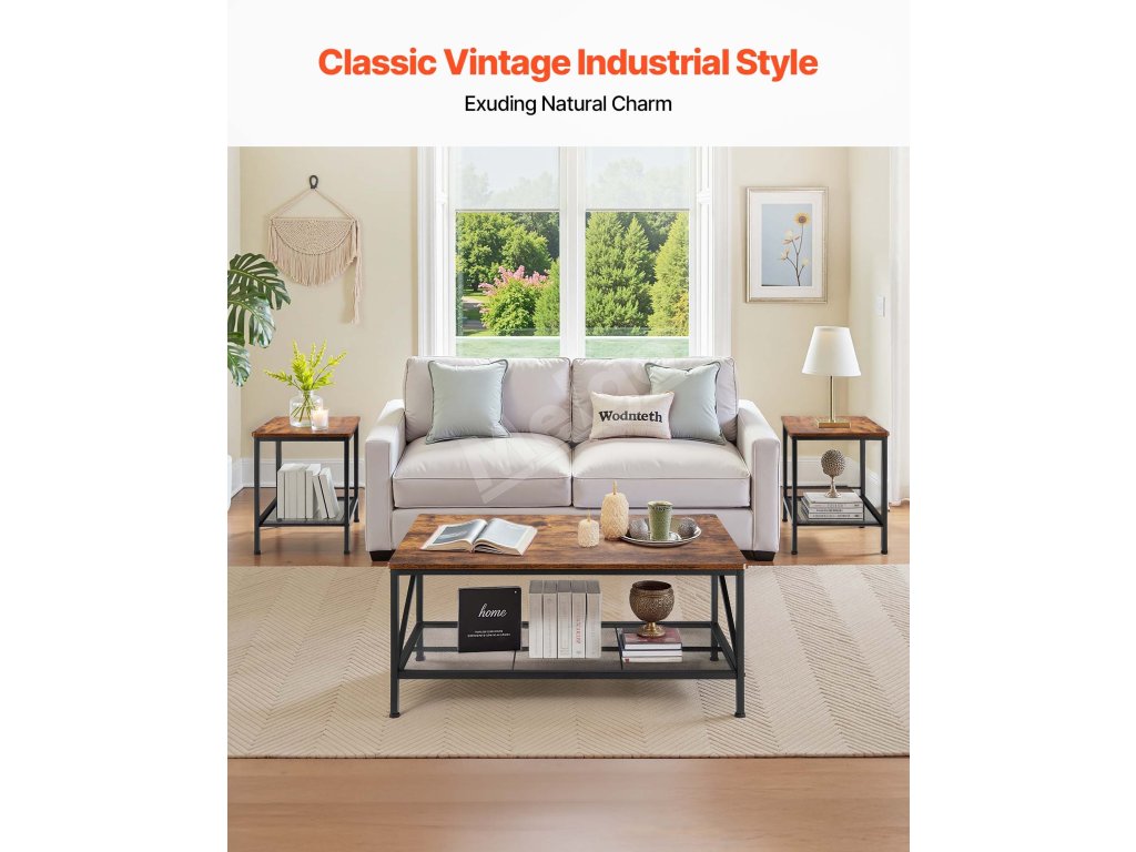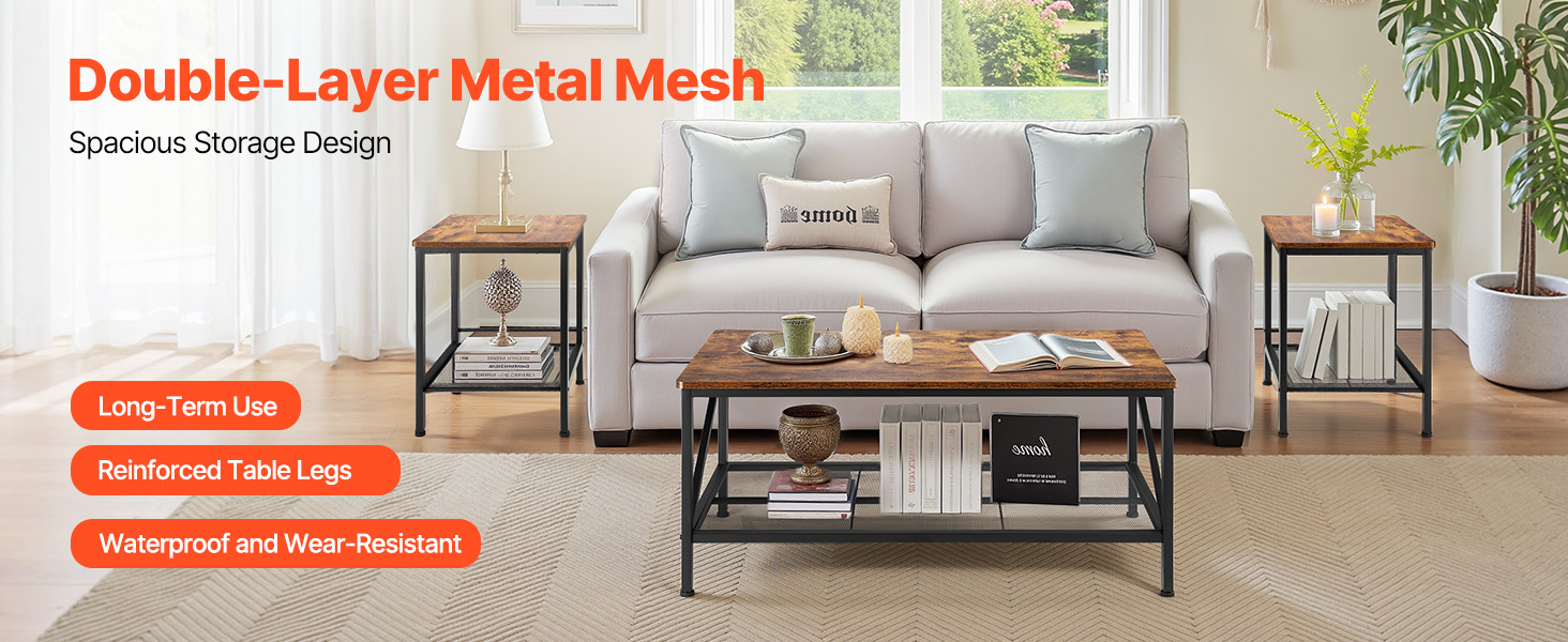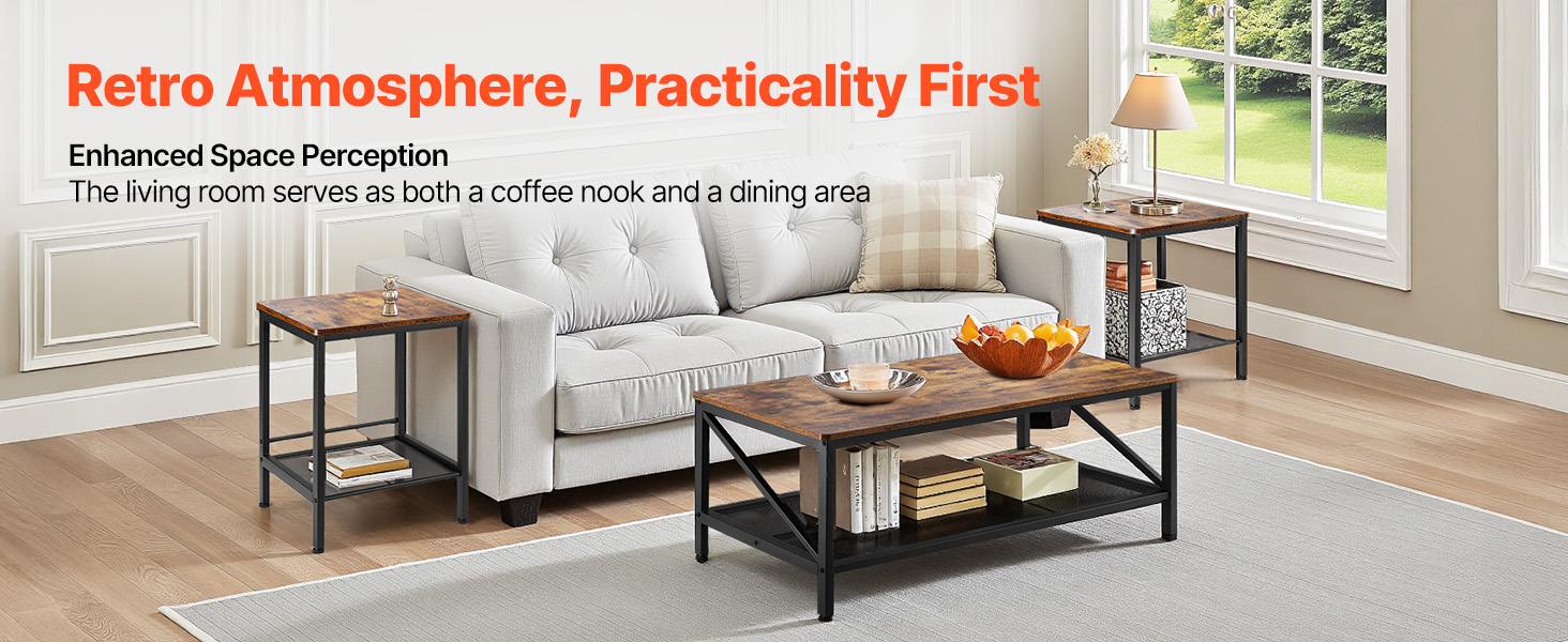 Táto súprava konferenčného a koncového stolíka vytvára vintage lesk, ktorý dopĺňa rôzne štýly bytového zariadenia. Je funkčná a zároveň všestranná, takže sa bez problémov začlení do vášho obytného priestoru.