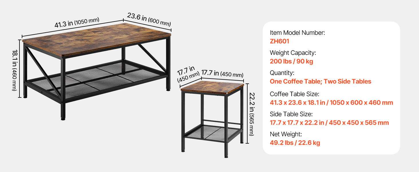 | Veľkosť bočného stolíka | 17.7 x 17,7 x 22,2 in / 450 x 450 x 565 mm |