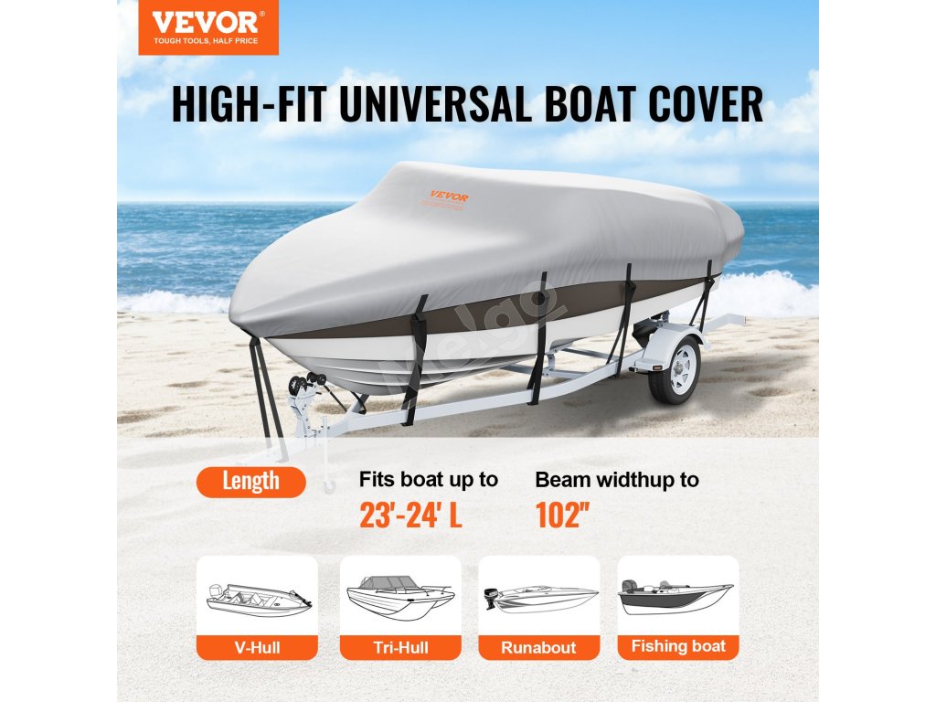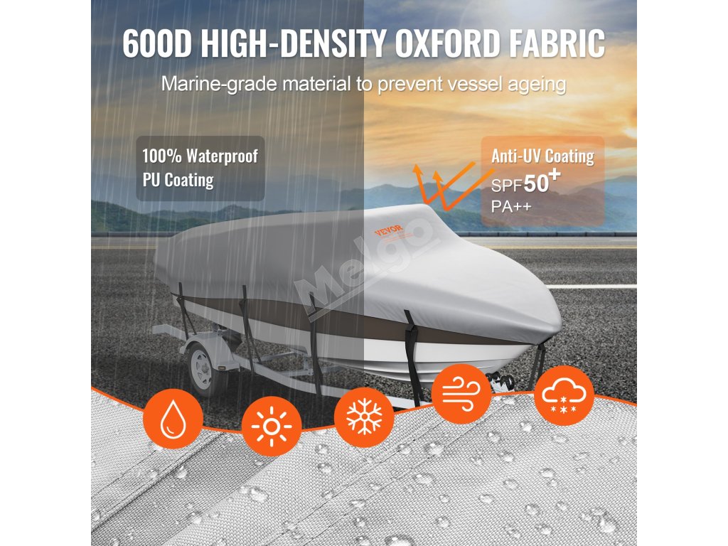 Naše plachty na lode sú šité na mieru (dĺžka: až 23 ft-24 ft; šírka: až 102 in) a sú vyrobené z oxfordskej tkaniny 600D v námornej kvalite. Vylepšené PU povlakom, sú 100 % vodotesné a odolné voči slnečnému žiareniu. Lisovaná vodotesná páska v plachte zaručuje, že cez ňu neprenikne voda.