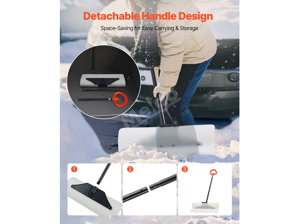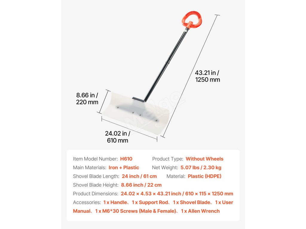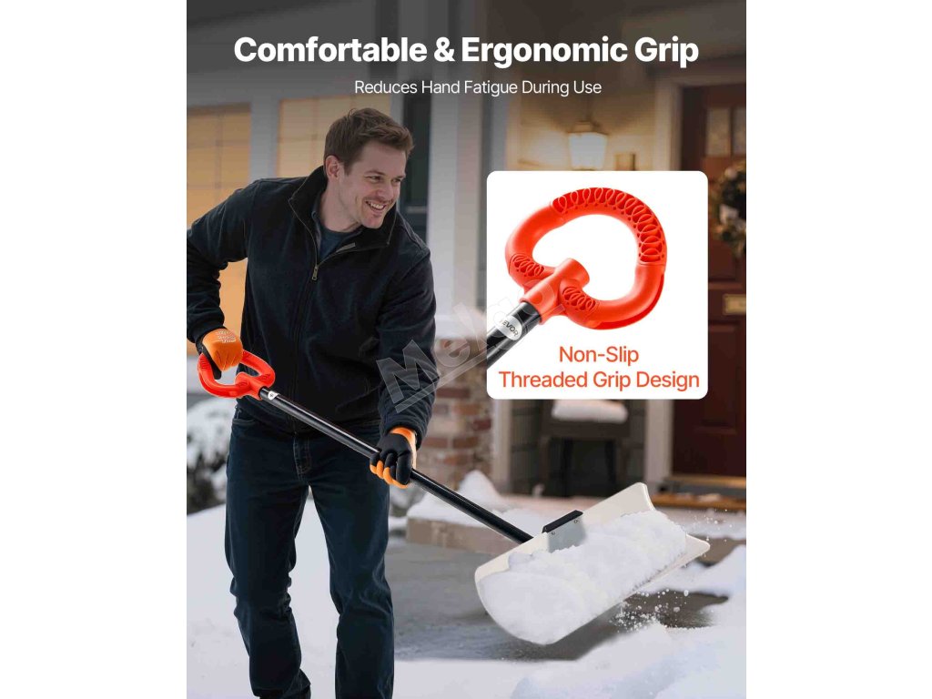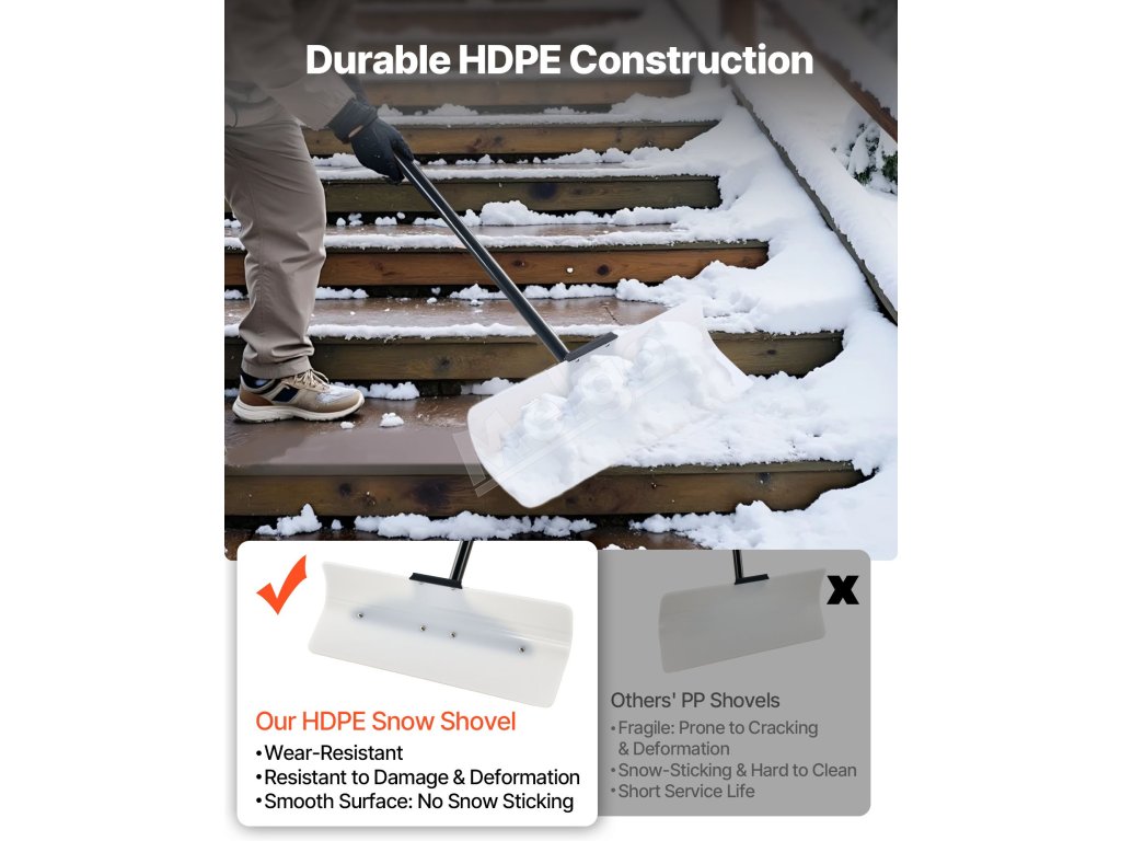 Táto 24-palcová lopata na odhŕňanie snehu odstráni väčšie plochy snehu na jeden prechod. Je vyrobená z odolného HDPE a jej hladký povrch zabraňuje prilepeniu snehu. Protišmyková rukoväť so závitom vám pohodlne padne do ruky, čím sa znižuje únava. Segmentová rukoväť umožňuje jednoduchú demontáž, je prenosná a šetrí miesto.