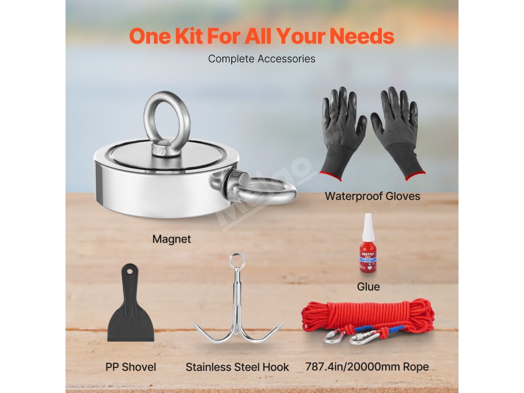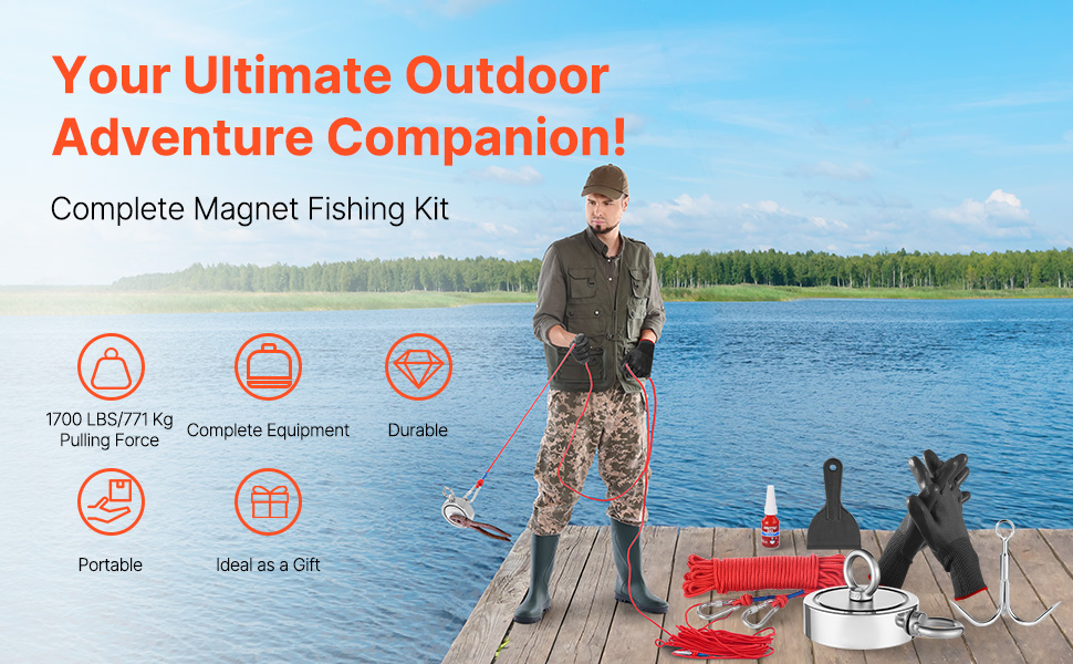 Táto magnetická rybárska súprava obsahuje vysokokvalitné neodymové magnety N35, ktoré ponúkajú silnú silu ťahu až 1700 LBS/771 Kg. Dodáva sa s kompletnou sadou príslušenstva. Vďaka dvojvrstvovej ochrane proti hrdzi a kompaktnému dizajnu sa ľahko prenáša a je ideálna na rôzne outdoorové dobrodružstvá.
