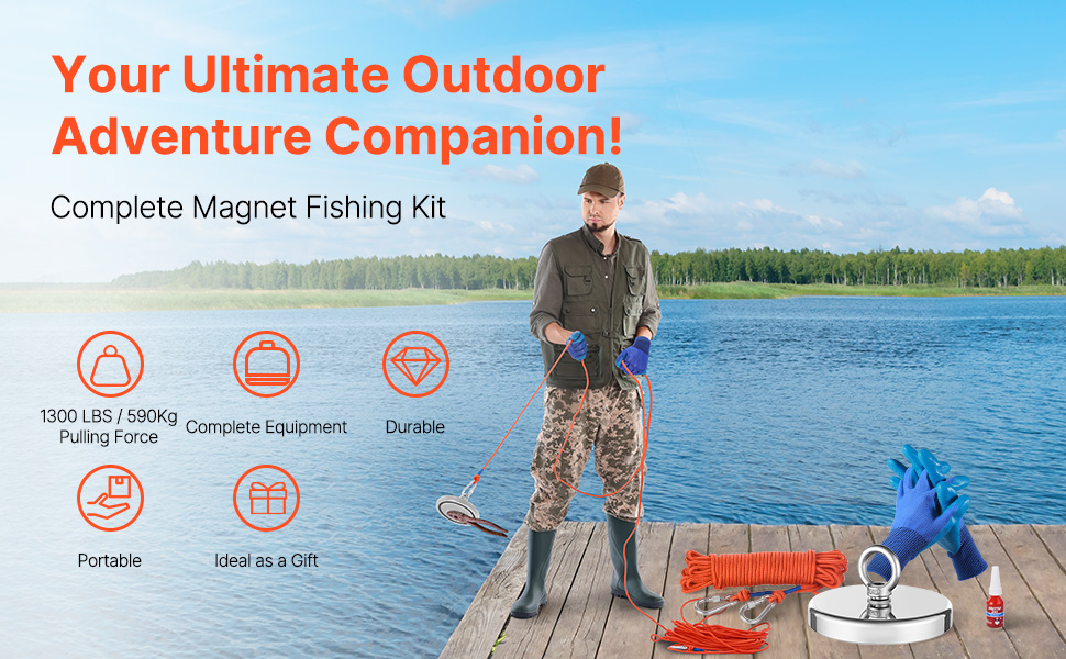 Táto magnetická rybárska súprava obsahuje vysokokvalitné neodymové magnety N35, ktoré ponúkajú silnú silu ťahu až 1300 LBS/590 Kg. Dodáva sa s kompletnou sadou príslušenstva. Vďaka dvojvrstvovej ochrane proti hrdzi a kompaktnému dizajnu sa ľahko prenáša a je ideálna na rôzne outdoorové dobrodružstvá.