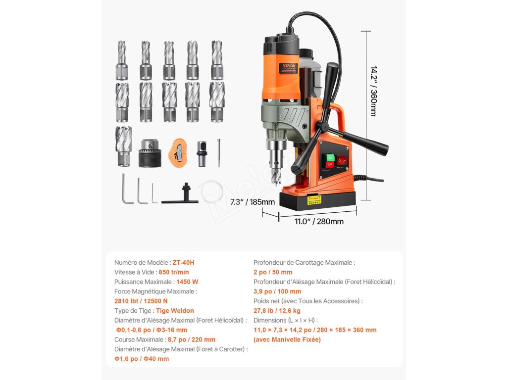 Magnetická vŕtačka 1450W, 1.6 in priemer, 2810lbf, 11 korún, 850 rpm
