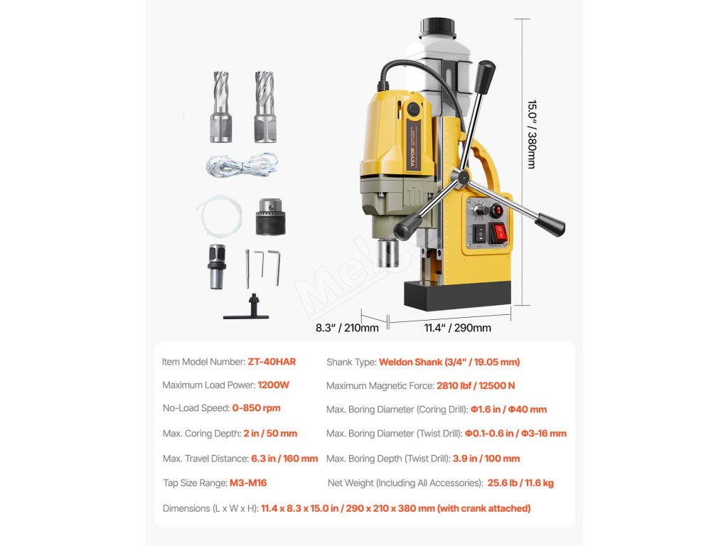 Magnetická vŕtačka 1200W priemer 1.6 in 2810 lbf 2 korunkové vrtáky