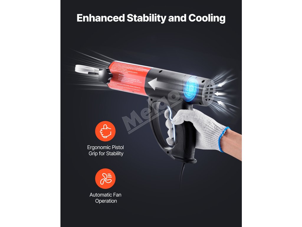Ručná konštrukcia zaručuje stabilné uchopenie a flexibilnejšie pracovné uhly. Zabudovaný chladiaci ventilátor pomáha chrániť časti citlivé na teplo. Jasné LED svetlo na konci vám pomôže bezproblémovo pracovať v tme a slúži ako upozornenie, aby ste sa nedotýkali cievok.