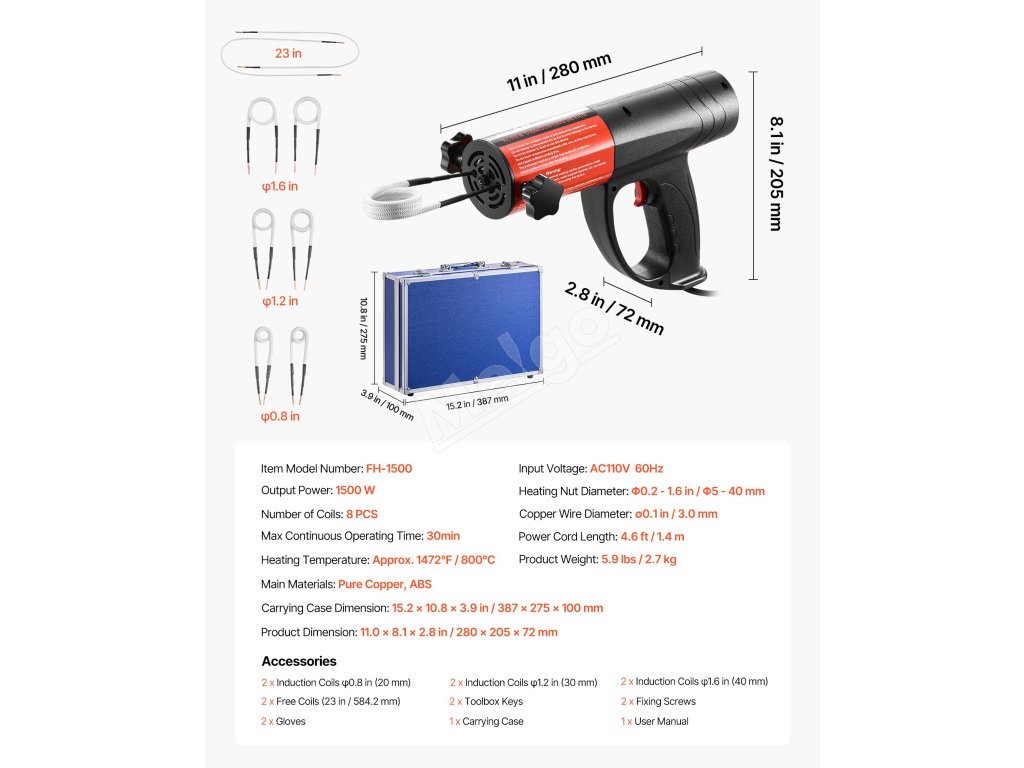 Indukčný ohrievač na uvoľnenie skrutiek 1500 W 230 V, ručný, 8 cievok
