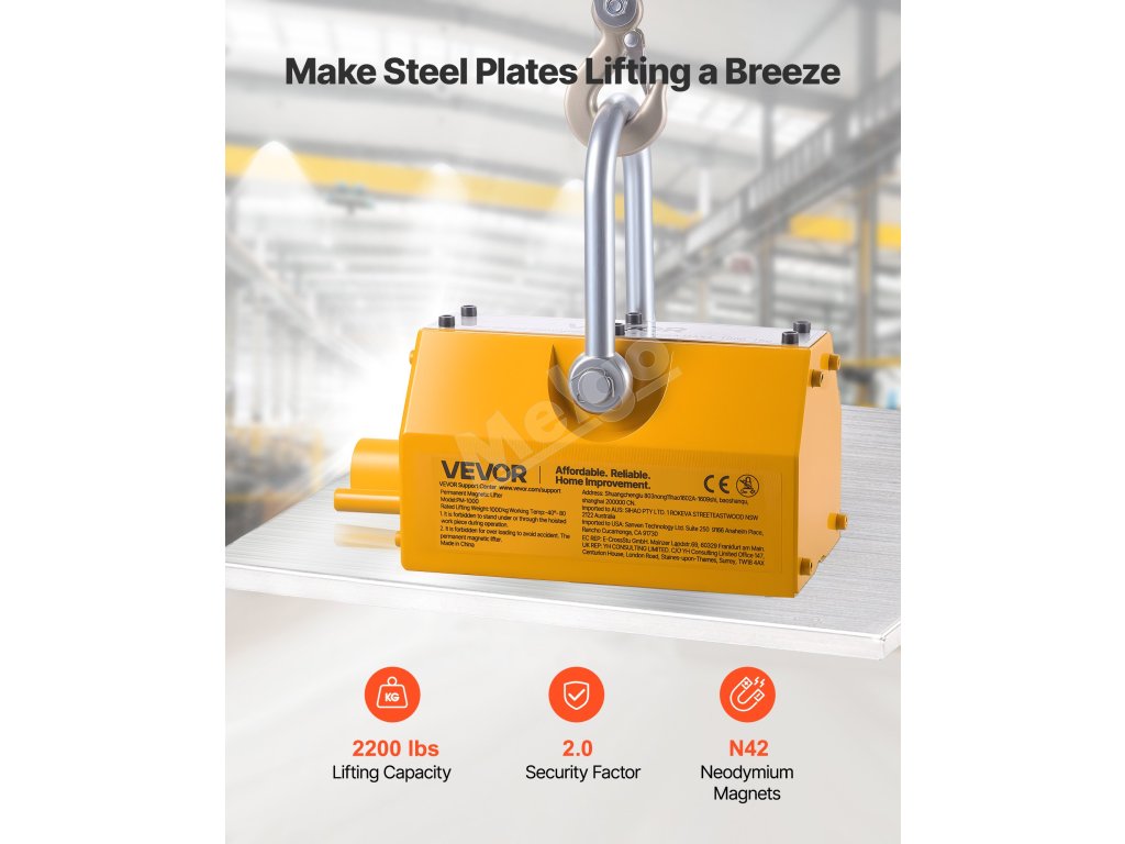 Permanentný magnetický zdvihák 1000 kg n42 s pákou a hákom na plechy