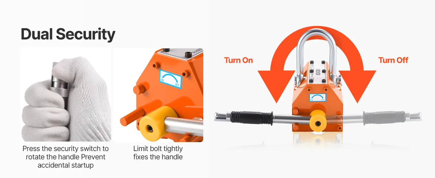 Náš zdvíhač poklopov šácht sa vyznačuje jednoduchým ovládaním jednou rukou. Prepína magnetickú silu bez elektrickej energie - otočením doľava aktivujete silný magnetizmus, otočením doprava ho uvoľníte.