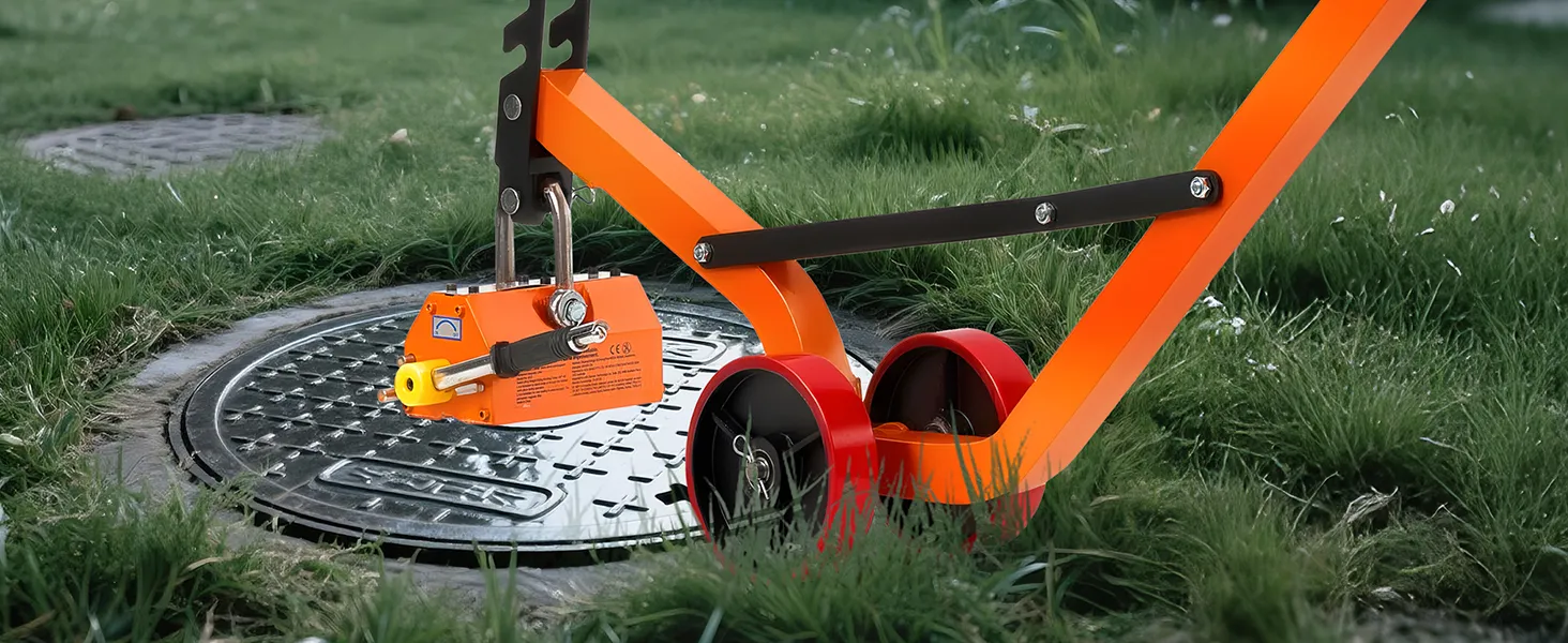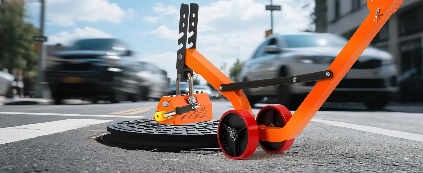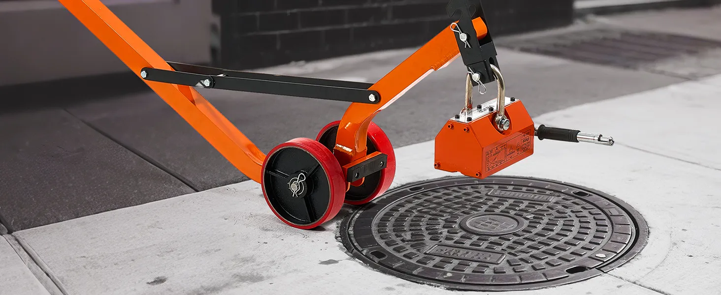 Magnetický zdvíhač poklopov 600 kg, oceľ, n42 neodým, 2 kolieska