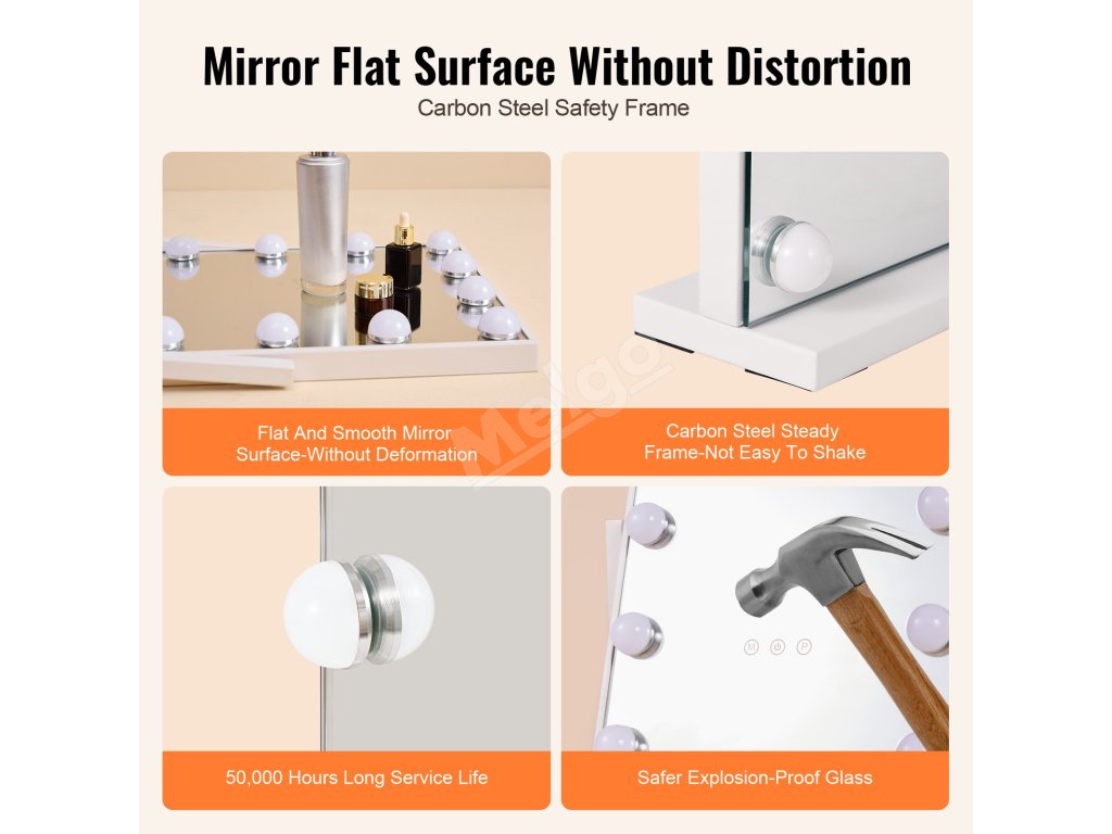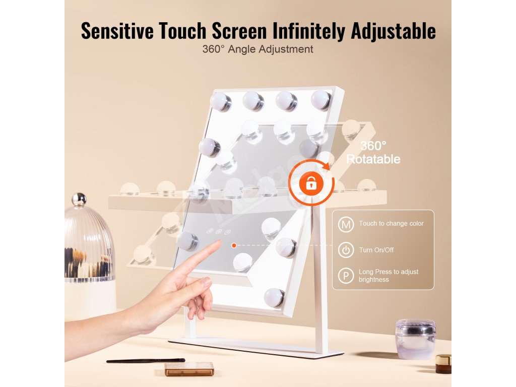 Toto kozmetické zrkadlo s vynikajúcim remeselným spracovaním vám prináša jedinečný zážitok z líčenia. Je vybavené 5-násobnou zväčšovacou šošovkou a dotykovým panelom s nastaviteľným jasom, môžete si vybrať správnu teplotu farieb, čo vám umožní ľahko zachytiť každý detail a vytvoriť nádherný vzhľad líčenia.