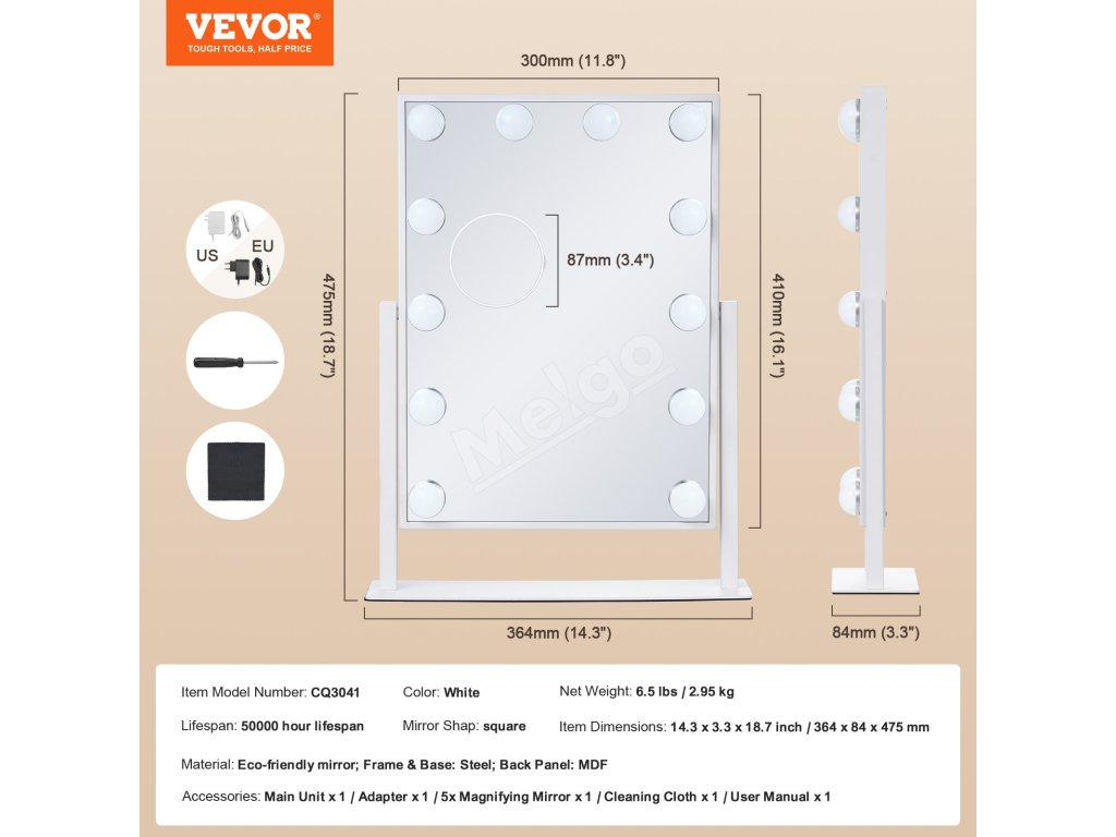 Toaletné zrkadlo 12 led stmiev. 3 režimy, 5× dotyk, 360°, 16.1×11.8 in