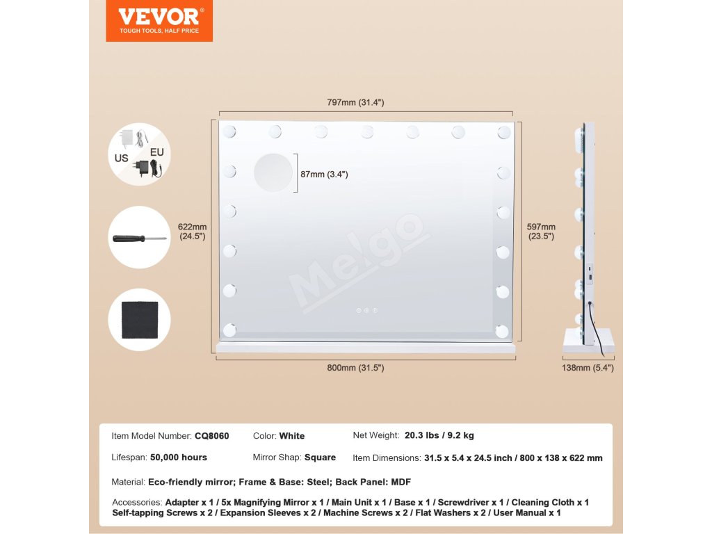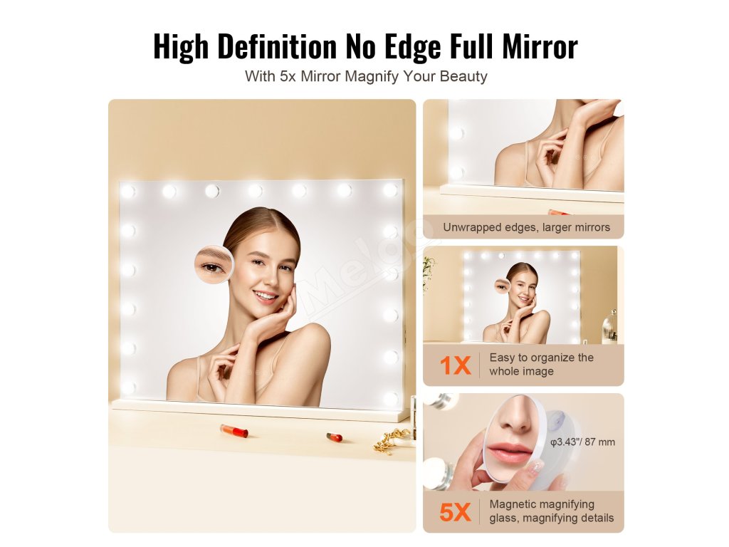 Toto kozmetické zrkadlo s vynikajúcim remeselným spracovaním vám prináša jedinečný zážitok z líčenia. Je vybavené 5-násobnou zväčšovacou šošovkou a dotykovým panelom s nastaviteľným jasom, môžete si vybrať správnu teplotu farieb, čo vám umožní ľahko zachytiť každý detail a vytvoriť nádherný vzhľad líčenia.