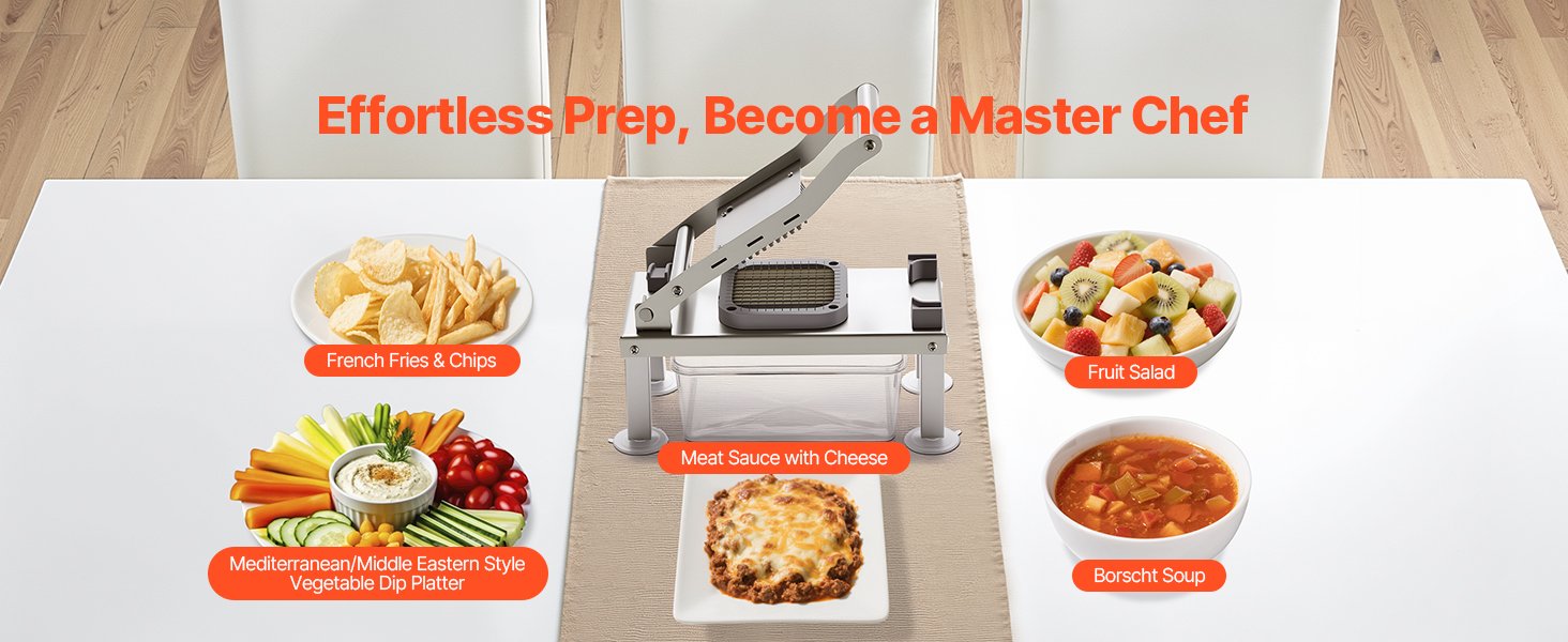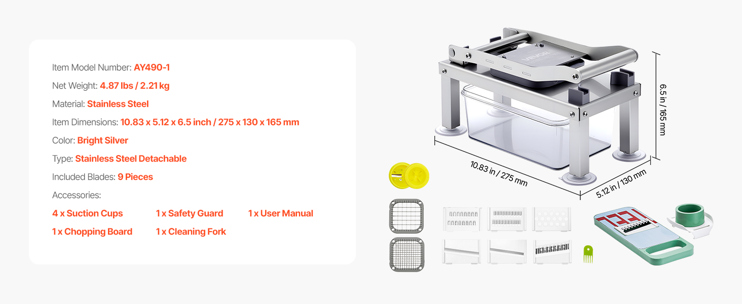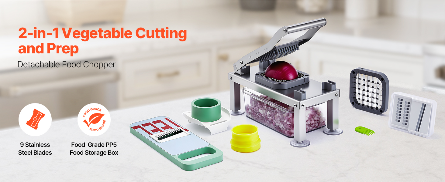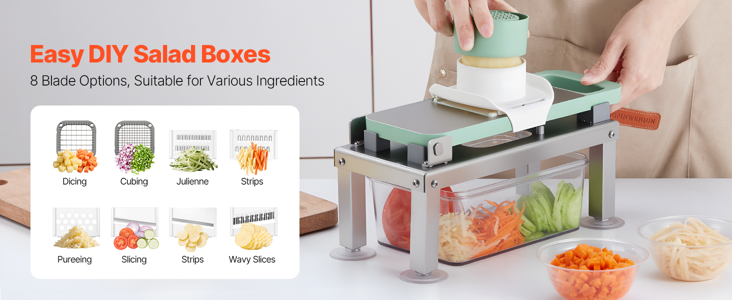 Vybavený viacerými veľkosťami čepelí, ktoré sú ideálne na uhorky, mrkvu, zemiaky a ďalšie prísady, čím spĺňa potreby rôznych jedál.