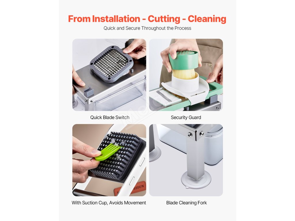Vybavený viacerými veľkosťami čepelí, ktoré sú ideálne na uhorky, mrkvu, zemiaky a ďalšie prísady, čím spĺňa potreby rôznych jedál.