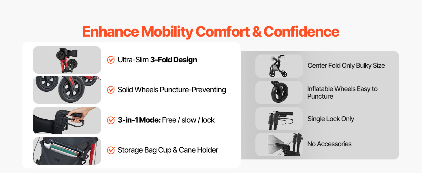 Tento chodítko s sedadlom kombinuje pevnú oporu s nosnosťou 300 libier, plynulý pohyb, ultrakompaktný 3-dielny dizajn a pohodlnú prenosnosť. Je navrhnuté tak, aby každodenná mobilita bola bezpečnejšia, jednoduchšia a pohodlnejšia pre ľudí s obmedzenou pohyblivosťou.