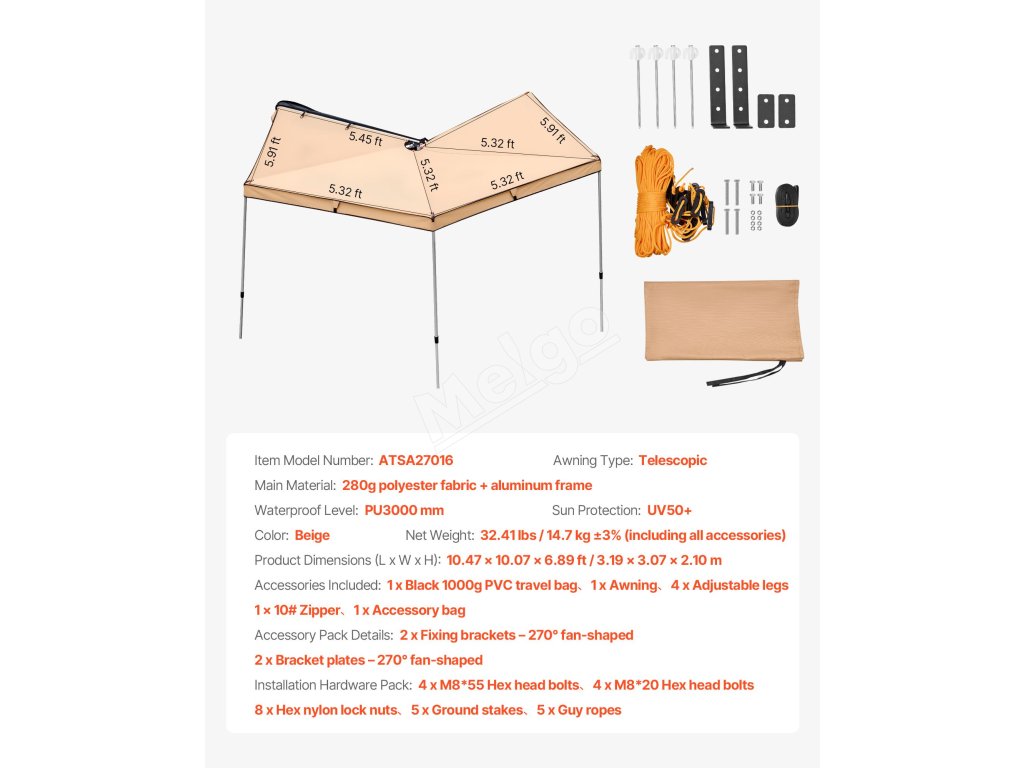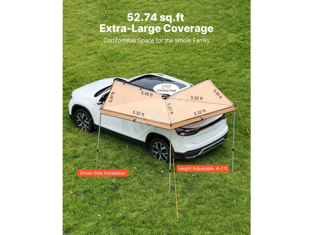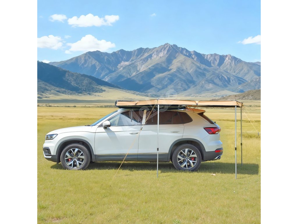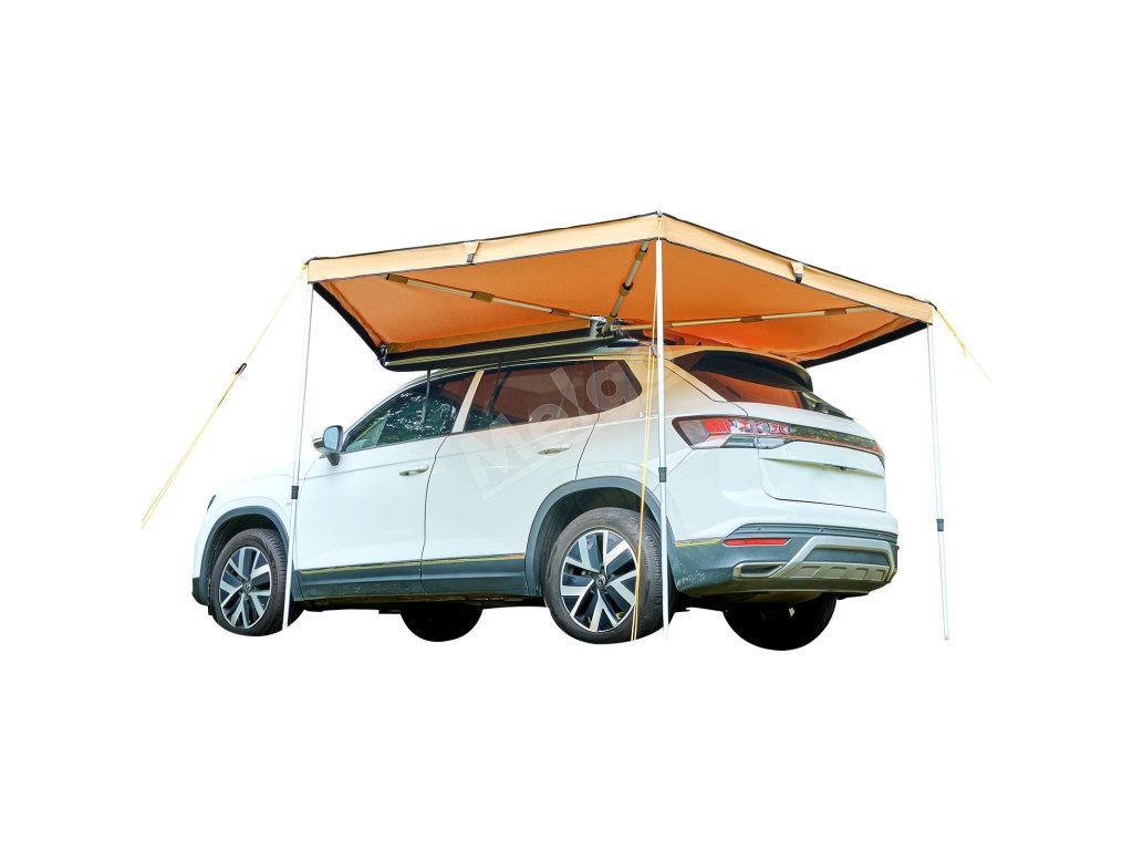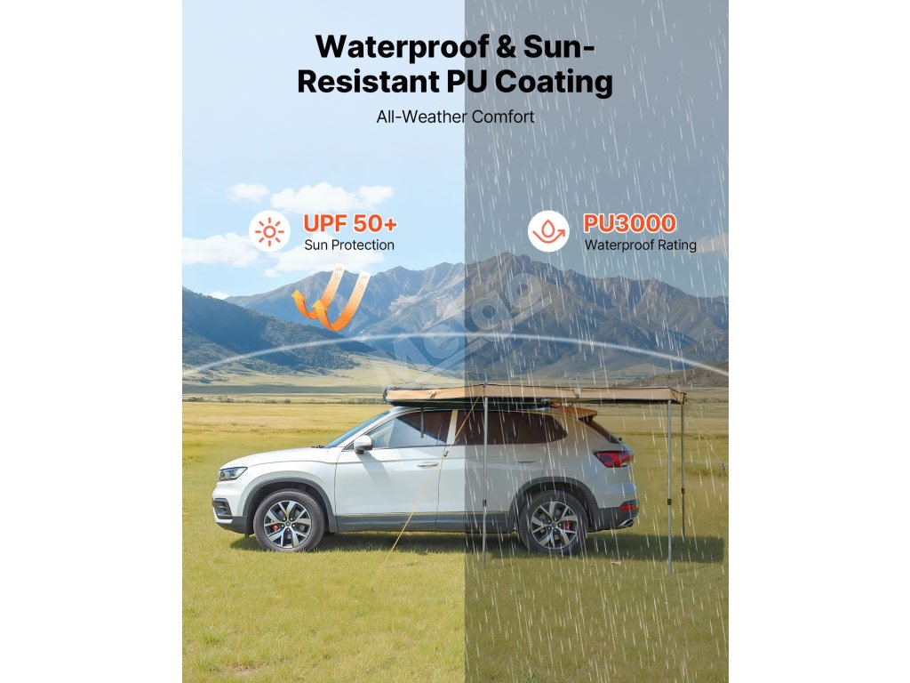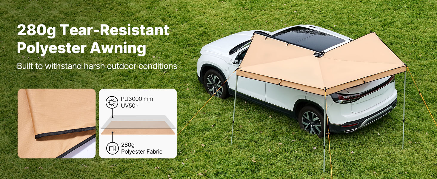 Markíza na auto vyrobená z polyesterovej tkaniny odolnej proti roztrhnutiu s hmotnosťou 280 g, vodotesnou povrchovou úpravou PU3000 mm a ochranou proti slnečnému žiareniu UV50+ poskytuje trojvrstvovú ochranu proti dažďu, slnku a poškriabaniu, čím zabezpečuje spoľahlivý prístrešok pri vonkajších aktivitách.