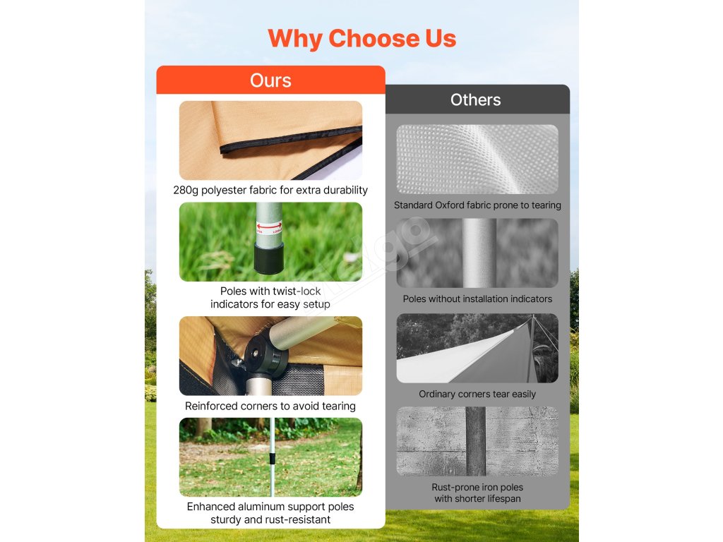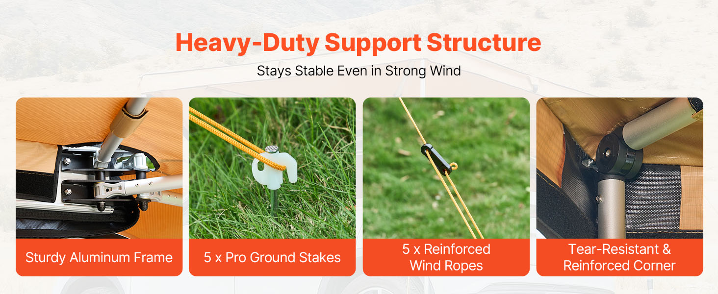 Podporovaná robustným hliníkovým rámom s profesionálnymi kolmi a zosilnenými lánami a navyše rohovými hranami odolnými proti roztrhnutiu zostáva táto 270-stupňová markíza stabilná aj na nerovnom teréne alebo v nepriaznivom počasí.