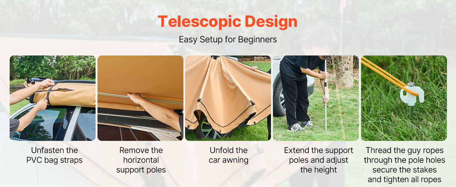 Výsuvná konštrukcia sa dodáva s predinštalovanými horizontálnymi a vertikálnymi podpornými tyčami, čo umožňuje bezproblémové nastavenie od uskladnenia až po rozbalenie. Postupujte podľa pokynov na rozloženie markízy pre rýchle nastavenie. Rozlúčte sa so zložitými krokmi. Ideálna na kempovanie alebo piknik v priebehu niekoľkých minút.