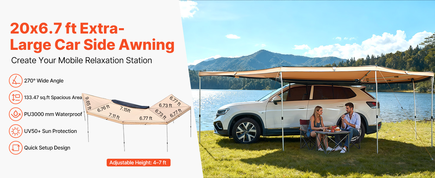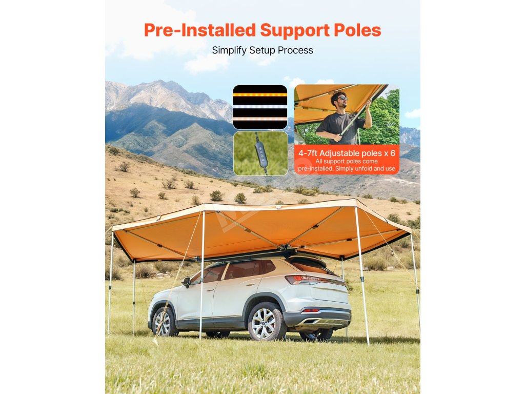 Táto bočná markíza na vozidlo má širokouhlú konštrukciu s uhlom 270° a výškou 6,89 m a ponúka veľkorysé pokrytie s ochranou proti UV žiareniu, vetru a vode. Ľahko sa pripevňuje na bočnú stranu vozidla na rýchle kempovanie za každého počasia, pikniky alebo vonkajšie zostavy.