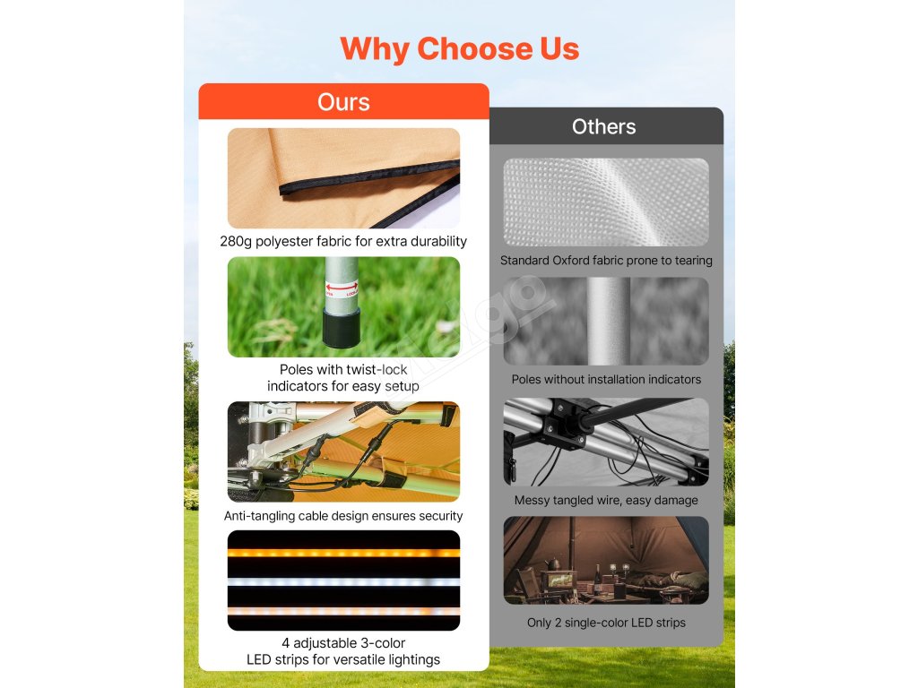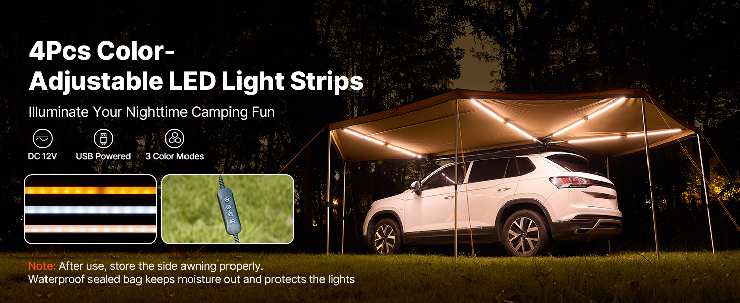 Vybavený 4 kusmi LED pásikov meniacich farbu, napájaných cez 12V DC alebo USB, čo umožňuje všestranné použitie z vozidla, prenosnej batérie alebo powerbanky. Tri nastaviteľné farby. Teplé svetlo pre útulnú atmosféru, biele pre jasné čítanie a studené svetlo pre núdzové úlohy v exteriéri.