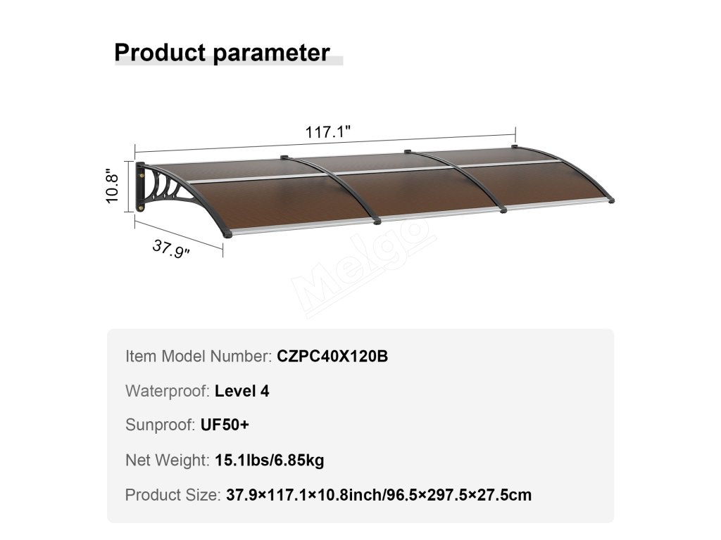 Markíza je vyrobená z priehľadných PC panelov, ABS držiakov a montážnych líšt z hliníkovej zliatiny, čo zaručuje trvanlivejšiu záruku kvality. Je odolná voči korózii a hrdzi, čím poskytuje dlhotrvajúcu ochranu pred silným vetrom a prudkým dažďom. A odoláva vysokým aj nízkym teplotám.