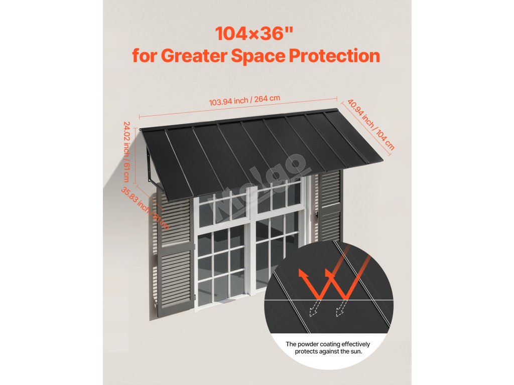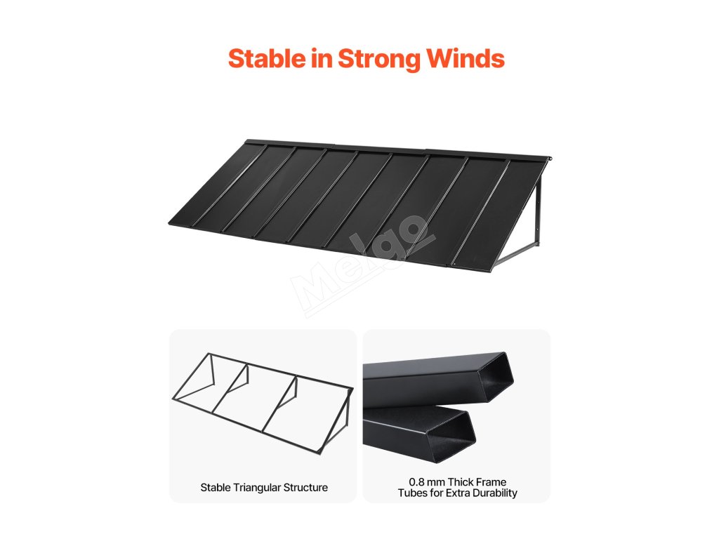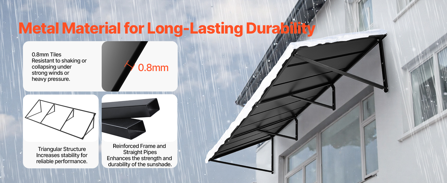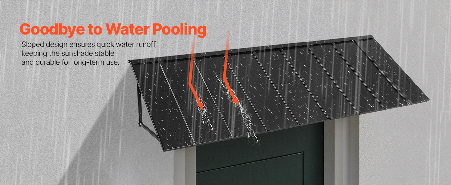 Táto strieška na dvere s rozmermi 104 × 36 palcov poskytuje dostatočné pokrytie na ochranu vašich dverí, okien a vonkajších priestorov. Zostáva pevná a odolná pri silnom vetre, daždi, snežení a pod intenzívnym slnečným svetlom. Šikmá konštrukcia zabezpečuje účinný odvod vody, čím zabraňuje jej hromadeniu.