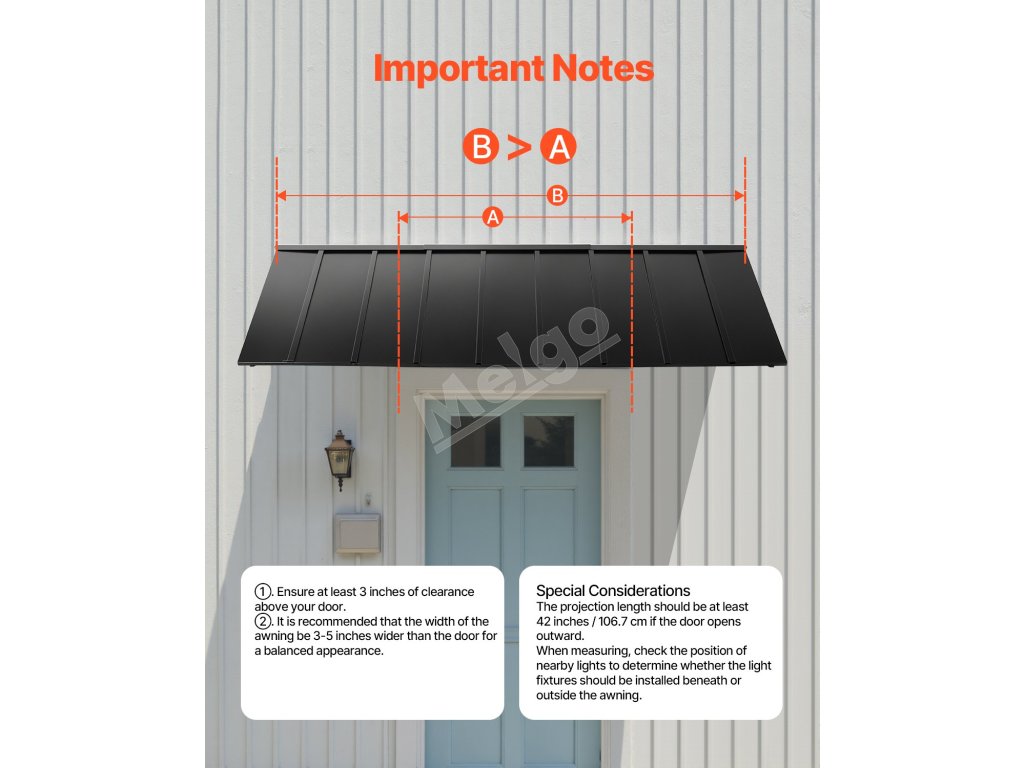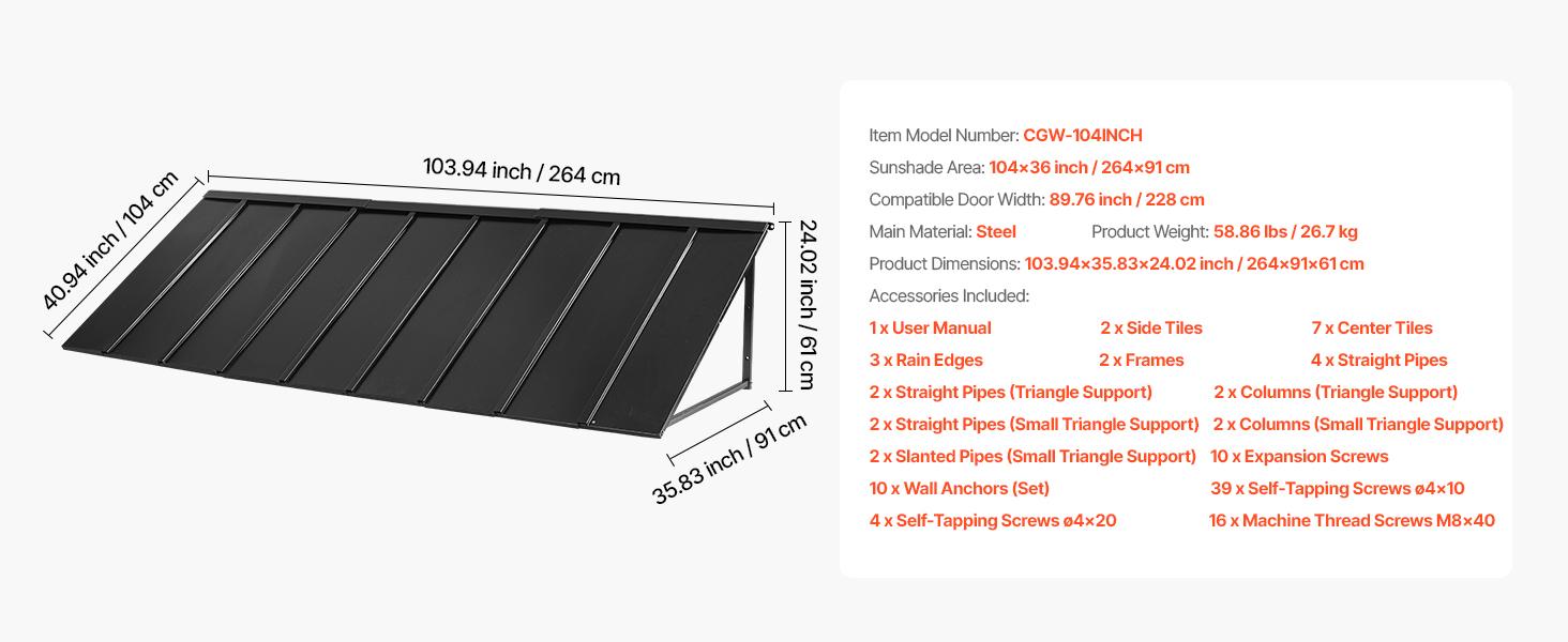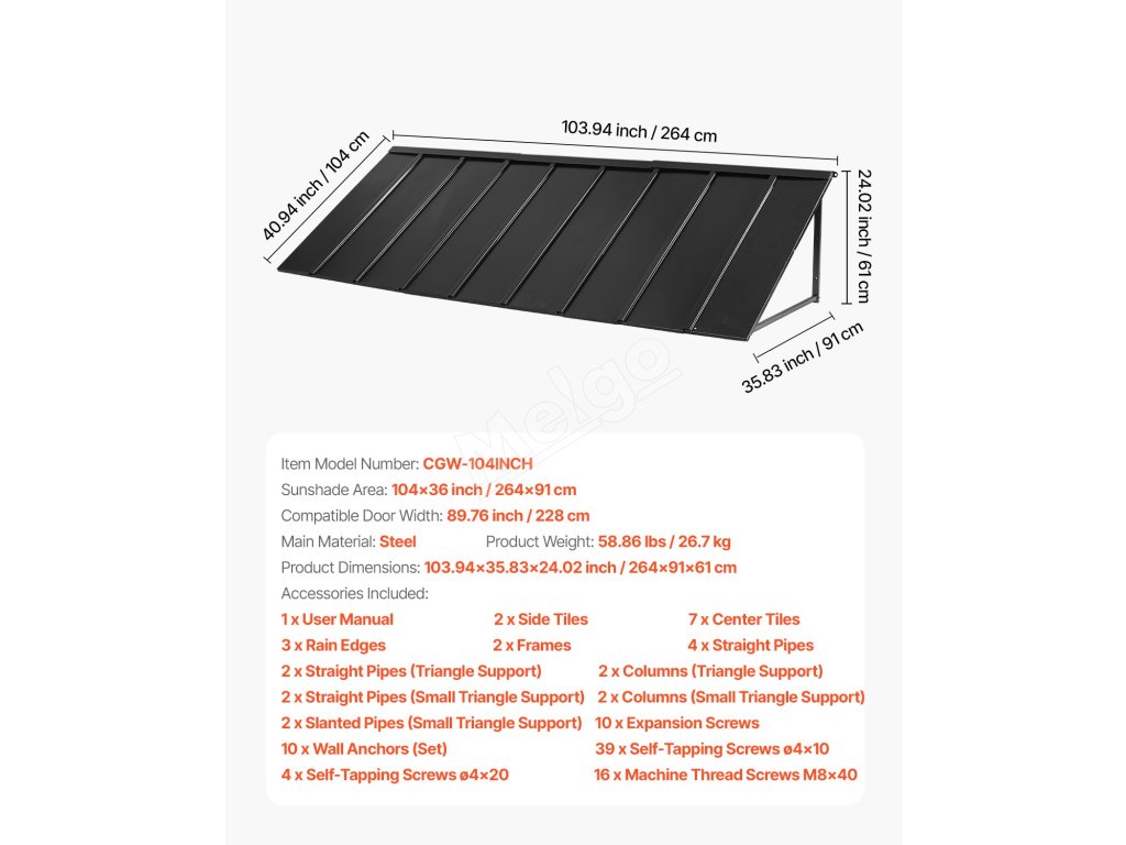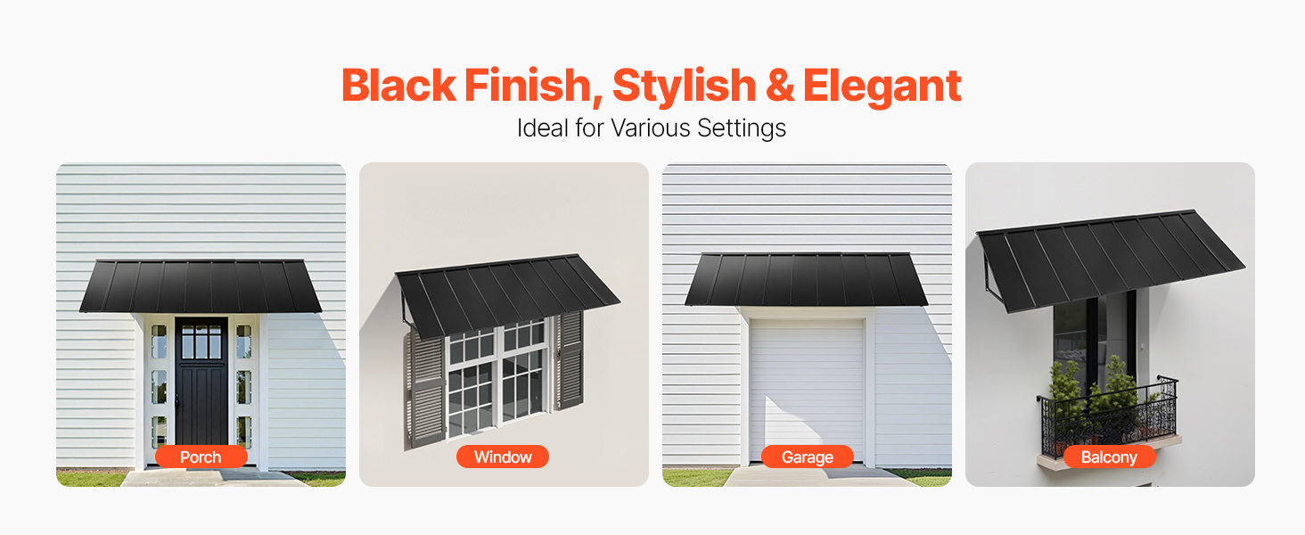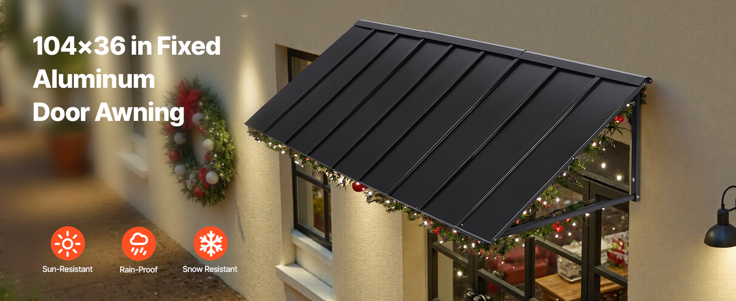 Táto strieška na dvere s rozmermi 104 × 36 palcov poskytuje dostatočné pokrytie na ochranu vašich dverí, okien a vonkajších priestorov. Zostáva pevná a odolná pri silnom vetre, daždi, snežení a pod intenzívnym slnečným svetlom. Šikmá konštrukcia zabezpečuje účinný odvod vody, čím zabraňuje jej hromadeniu.