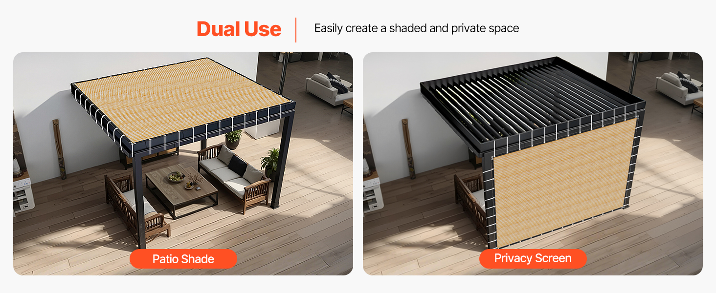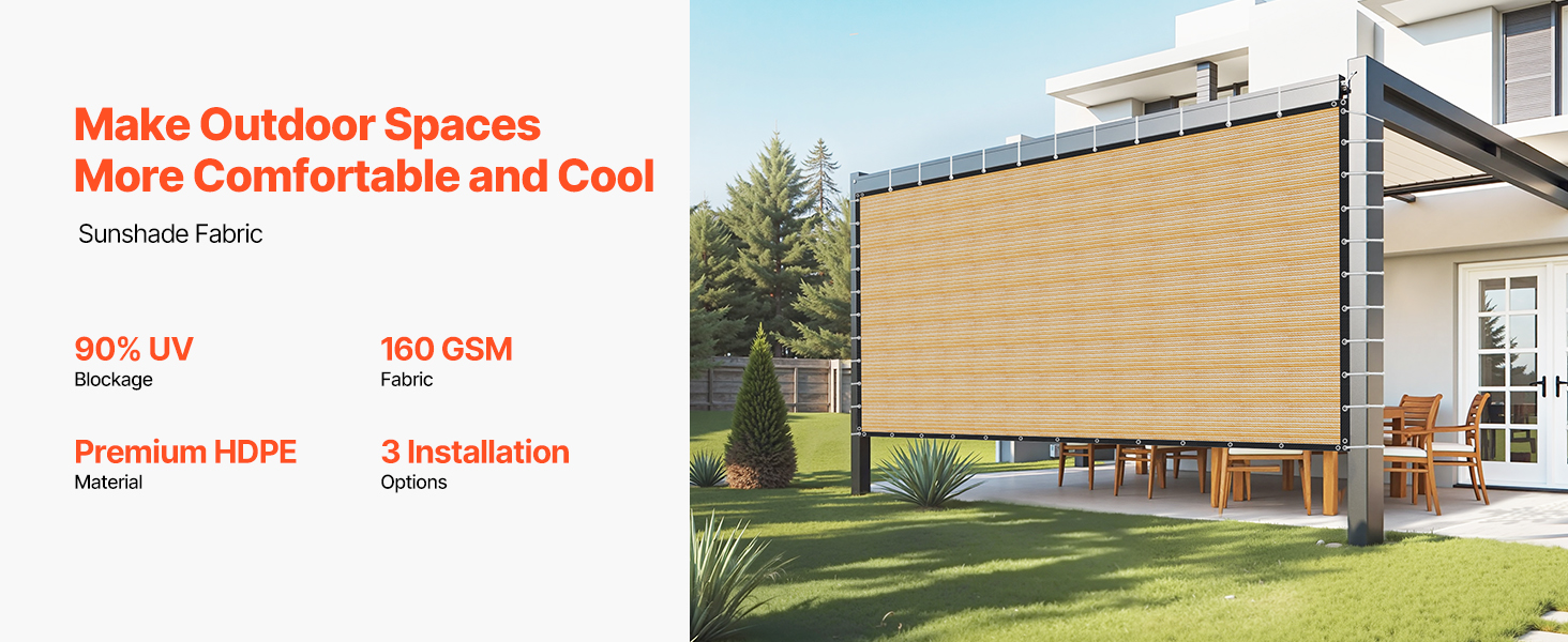 Tkanina HDPE s vysokou hustotou 160 GSM je odolná proti roztrhnutiu, vodotesná a priedušná. Blokuje slnečné žiarenie pre trvalý tieň a pohodlie. Vďaka priechodkám z nehrdzavejúcej ocele, 30 zipsom, 5 elastickým guľôčkam a 4 nylonovým lanám umožňuje flexibilnú inštaláciu na ochranu pred slnkom a súkromia.