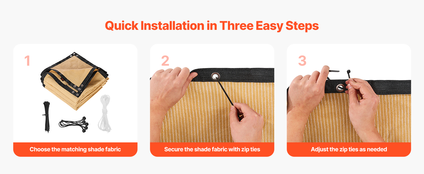 Naša tieniaca tkanina obsahuje 30 čiernych zipsov, 5 elastických guličiek a 4 nylonové laná, čo umožňuje rýchlu inštaláciu v iba 3 jednoduchých krokoch. Môžete si vybrať spôsob inštalácie, ktorý najlepšie vyhovuje vašim potrebám, aby ste získali bezproblémový zážitok.
