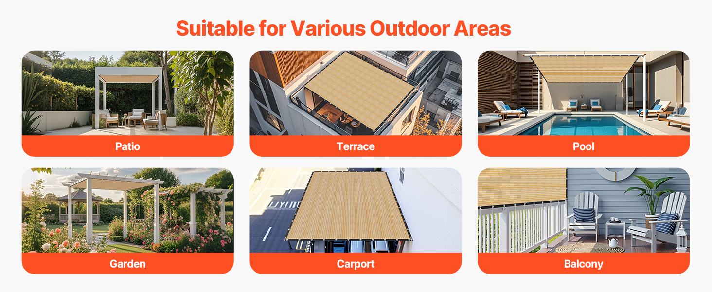 Táto tieniaca tkanina je určená na rôzne vonkajšie prostredie, ako sú terasy, terasy, bazény, záhrady, prístrešky a balkóny. Účinne blokuje slnečné žiarenie a zároveň zvyšuje komfort vášho vonkajšieho prostredia.