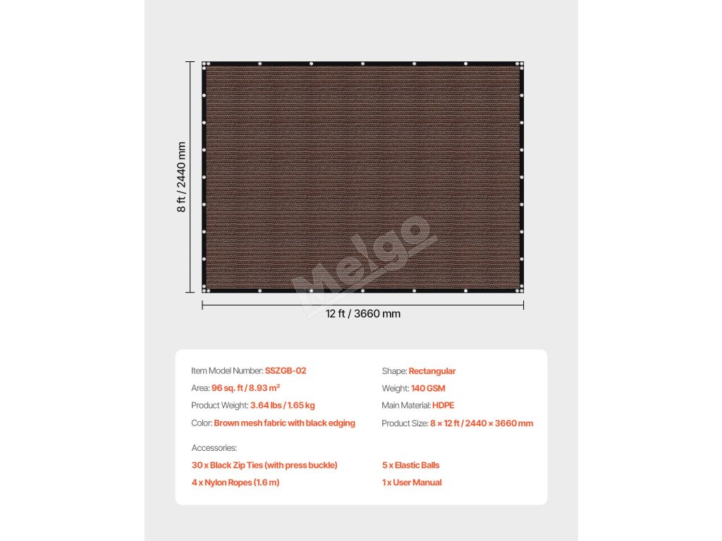 Tkanina HDPE s vysokou hustotou 140 GSM je odolná proti roztrhnutiu, vodotesná a priedušná. Blokuje slnečné žiarenie pre trvalý tieň a pohodlie. Vďaka priechodkám z nehrdzavejúcej ocele, 30 zipsom, 5 elastickým guľôčkam a 4 nylonovým lanám umožňuje flexibilnú inštaláciu na ochranu pred slnkom a súkromia.