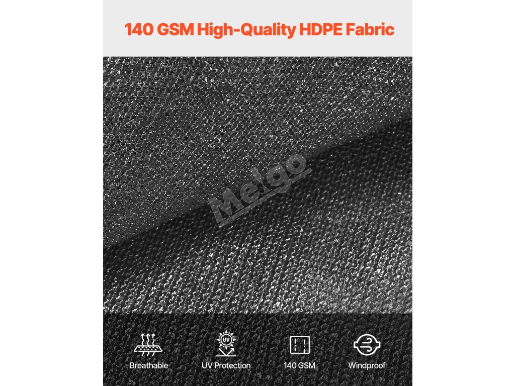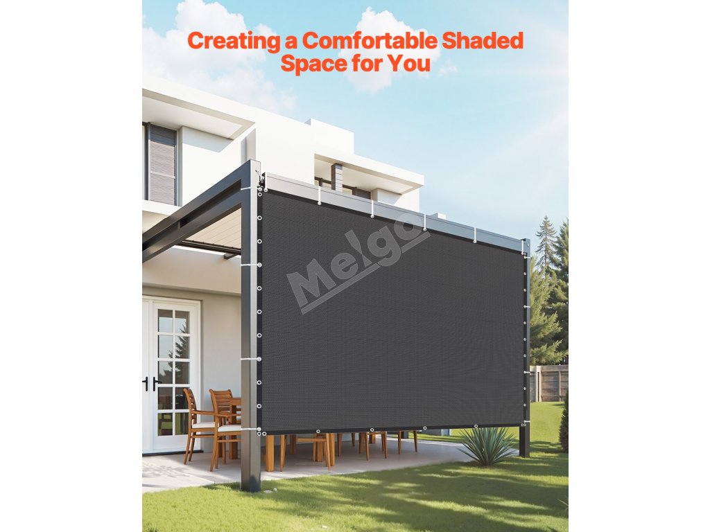 Tkanina HDPE s vysokou hustotou 140 GSM je odolná proti roztrhnutiu, vodotesná a priedušná. Blokuje slnečné žiarenie pre trvalý tieň a pohodlie. Vďaka priechodkám z nehrdzavejúcej ocele, 30 zipsom, 5 elastickým guľôčkam a 4 nylonovým lanám umožňuje flexibilnú inštaláciu na ochranu pred slnkom a súkromia.