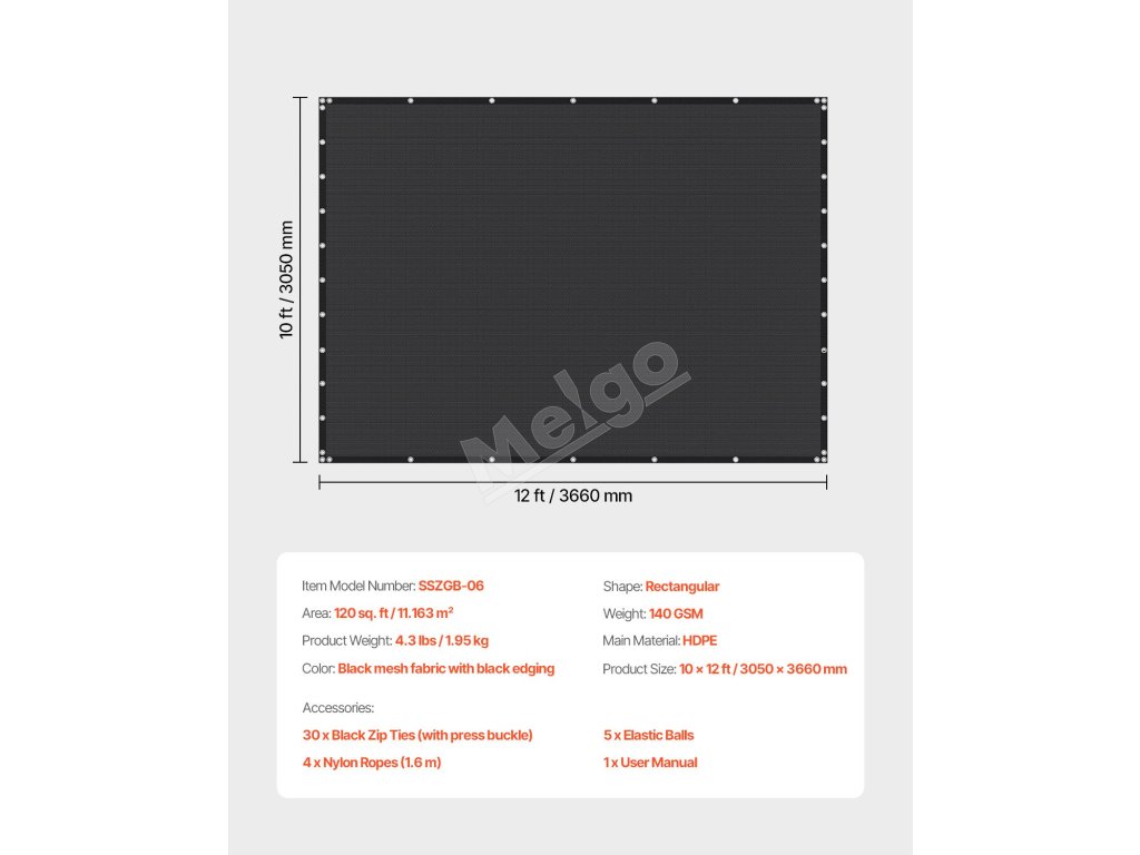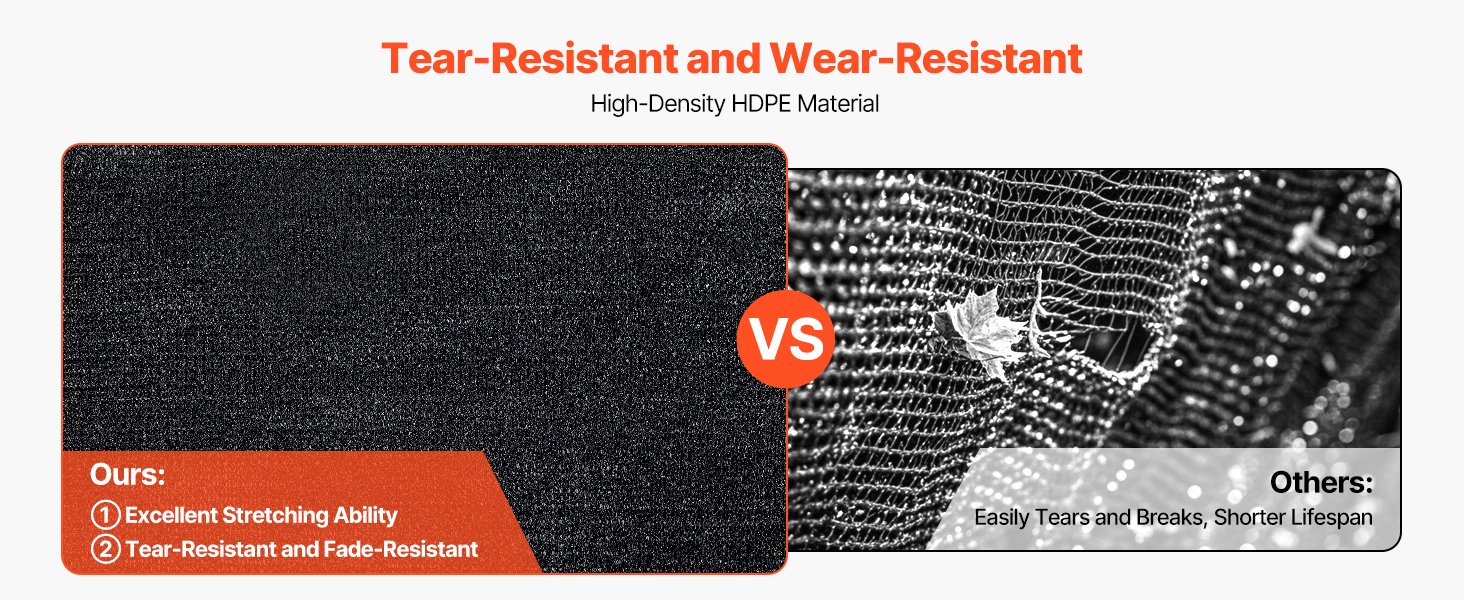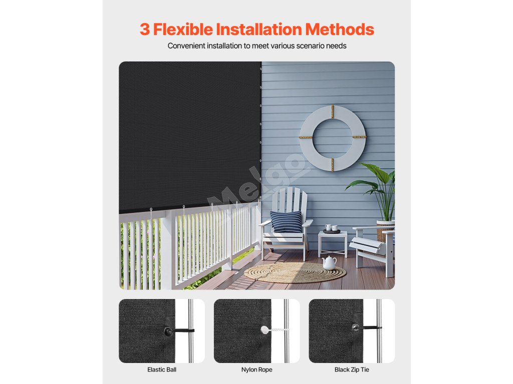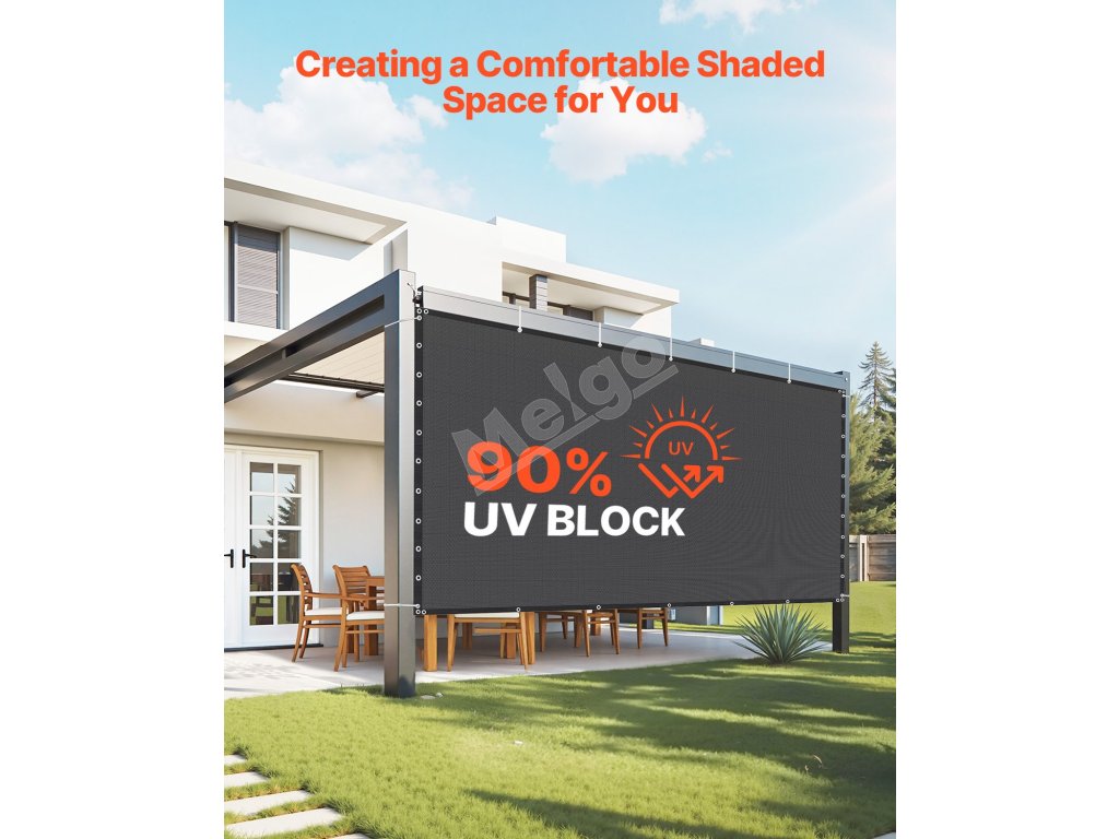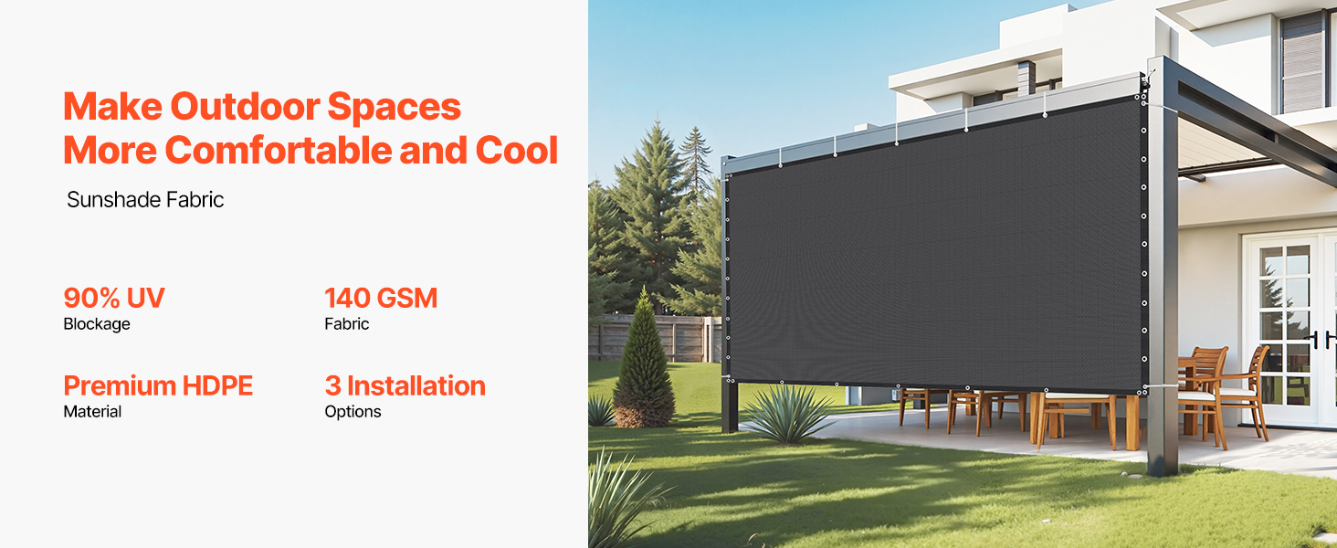 Tkanina HDPE s vysokou hustotou 140 GSM je odolná proti roztrhnutiu, vodotesná a priedušná. Blokuje slnečné žiarenie pre trvalý tieň a pohodlie. Vďaka priechodkám z nehrdzavejúcej ocele, 30 zipsom, 5 elastickým guľôčkam a 4 nylonovým lanám umožňuje flexibilnú inštaláciu na ochranu pred slnkom a súkromia.