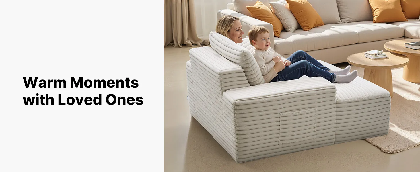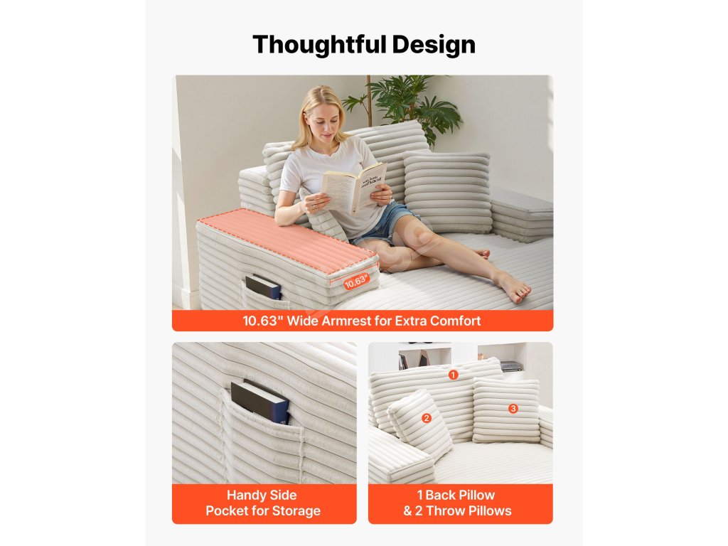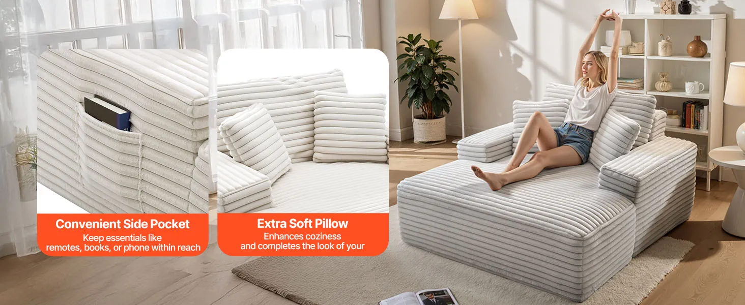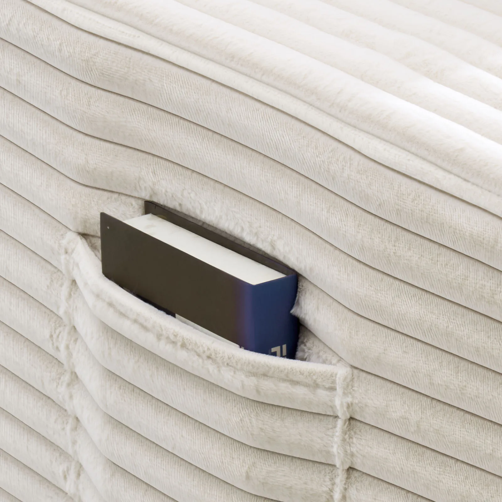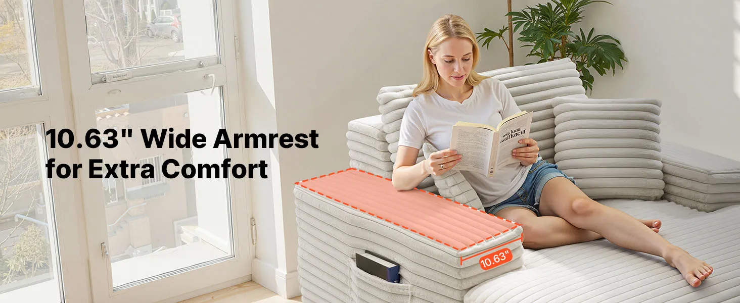 Prémiové čalúnenie je jemné na dotyk, zatiaľ čo 11 palcov/279 mm široké opierky rúk a praktické bočné vrecká umocnia váš zážitok z leňošenia
