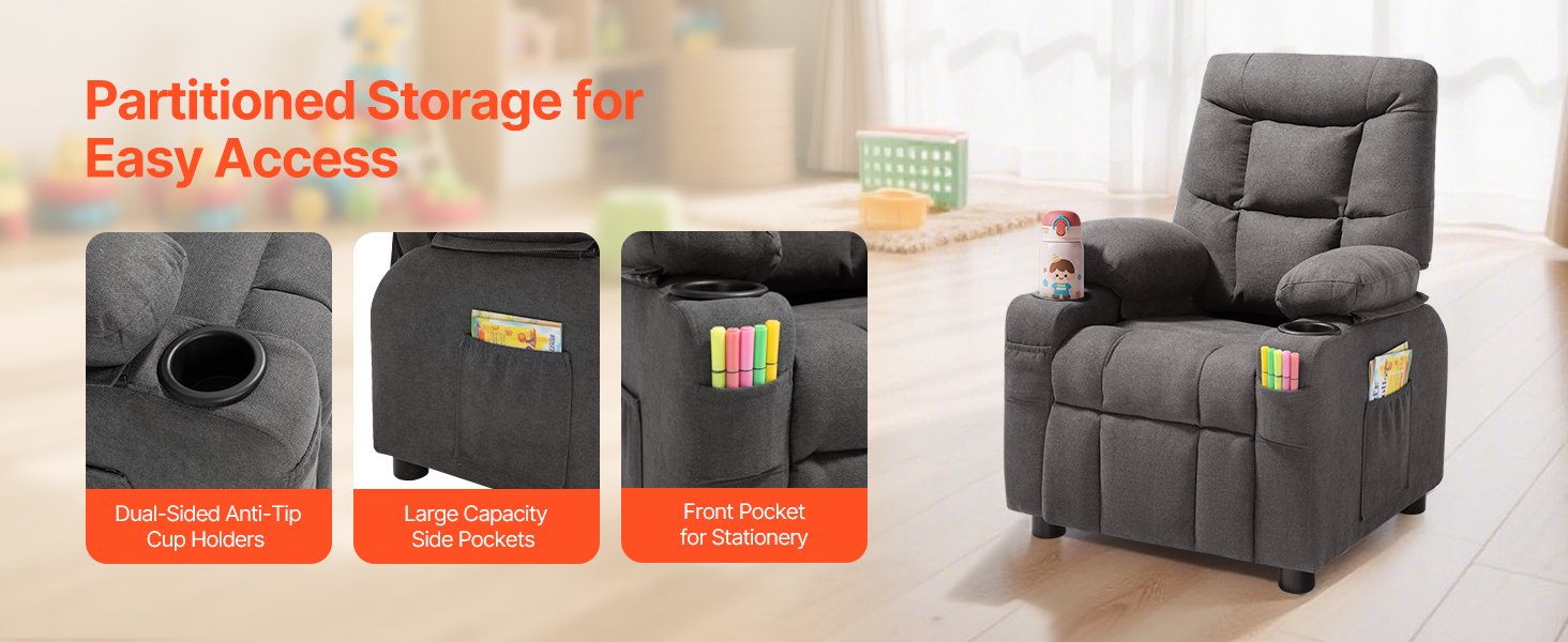 Detské kreslo je navrhnuté s odolnými držiakmi na poháre na oboch stranách, ktoré udržujú detské poháre v bezpečí. Väčšie bočné vrecko pojme detské knihy alebo hračky a malé predné vrecko môže slúžiť na uloženie pier a písacích potrieb.