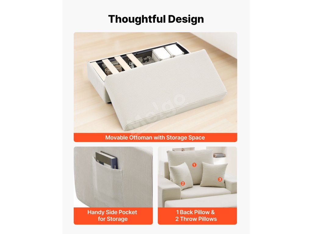 Prémiové čalúnenie je príjemné na dotyk, zatiaľ čo pohyblivá úložná taburetka a praktické bočné vrecká vylepšujú váš zážitok z oddychu.