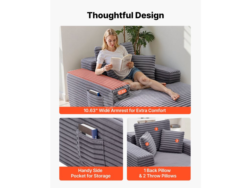 Prémiové čalúnenie je jemné na dotyk, zatiaľ čo 11 palcov/279 mm široké opierky rúk a praktické bočné vrecká umocnia váš zážitok z leňošenia