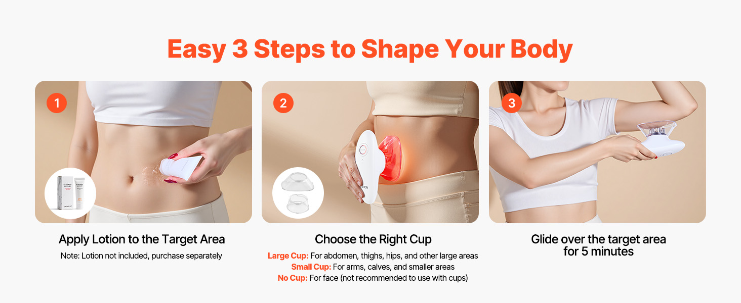 Tento prístroj na spevnenie pokožky rýchlo vytvaruje vaše telo v troch krokoch. Najprv naneste krém na cieľovú oblasť. Po druhé, vyberte správnu šálku. Nakoniec prístrojom 5 minút kĺžte po danej oblasti. Jednoduché spustenie.
