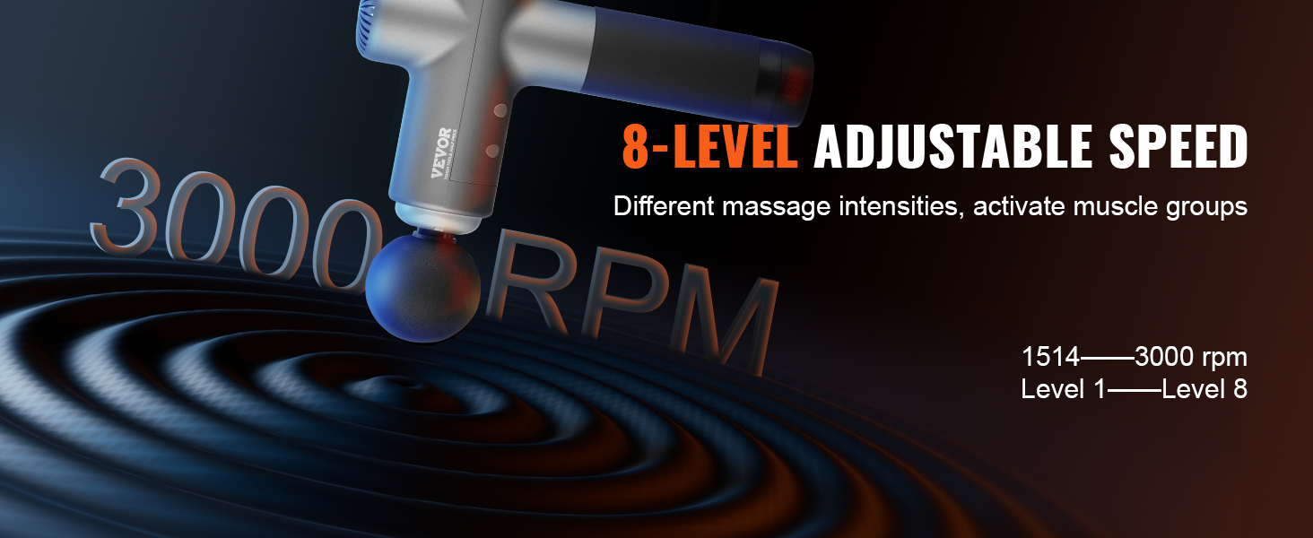 Vďaka 8 nastaviteľným úrovniam rýchlosti ponúka tento perkusný masážny prístroj na hlboké svaly rozsah intenzity od 1514 ot/min do 3000 ot/min. Či už potrebujete jemnú relaxáciu alebo hĺbkovú masáž tkanív, aktivuje svalové skupiny a rýchlo zmierňuje svalovú únavu.