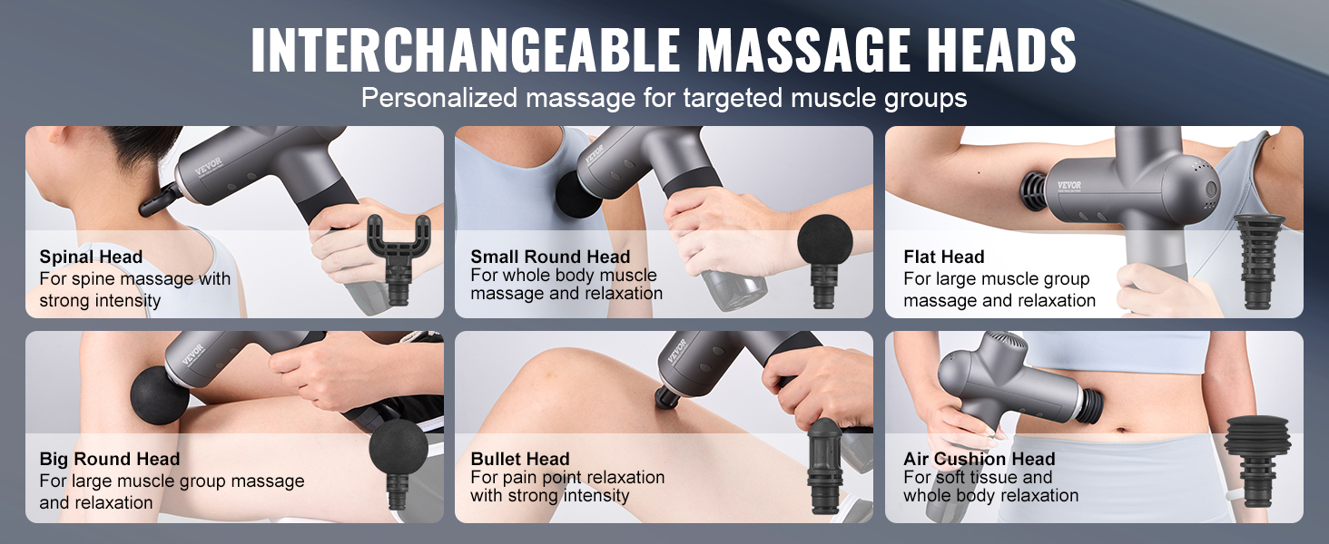 Vďaka 6 vymeniteľným masážnym hlaviciam ponúka tento prenosný ručný masážny prístroj personalizované masáže prispôsobené rôznym svalovým skupinám a potrebám. Či už ide o hĺbkovú tkanivovú masáž alebo povrchovú relaxáciu, poskytuje komplexný komfort a úľavu.