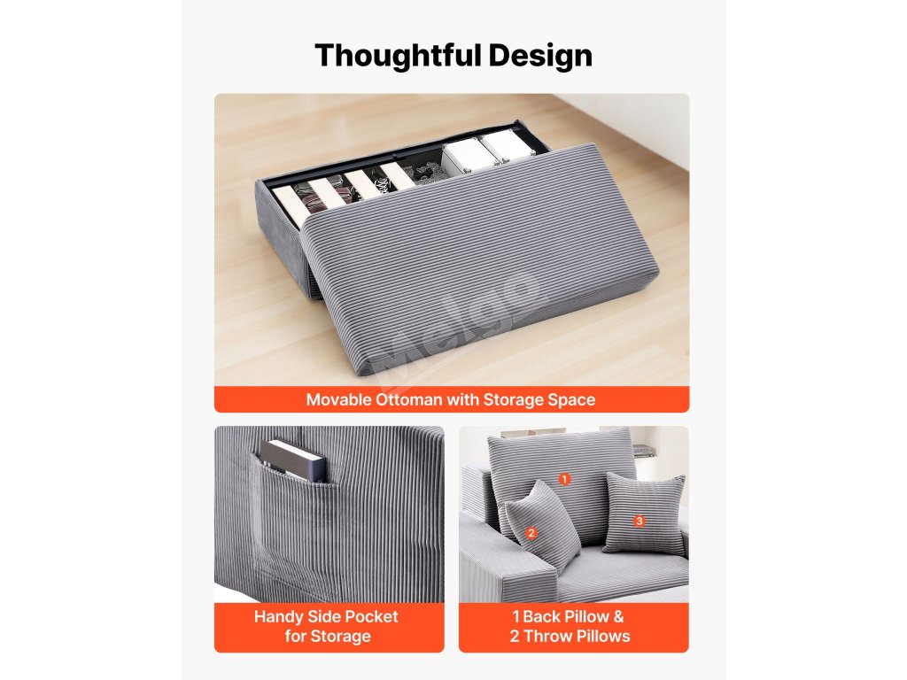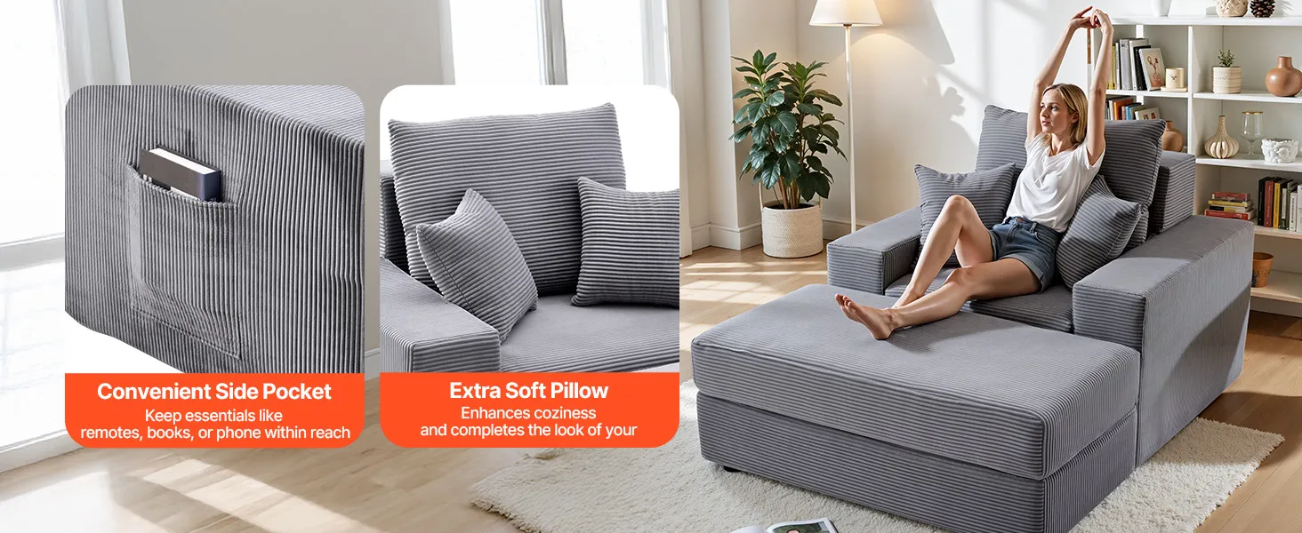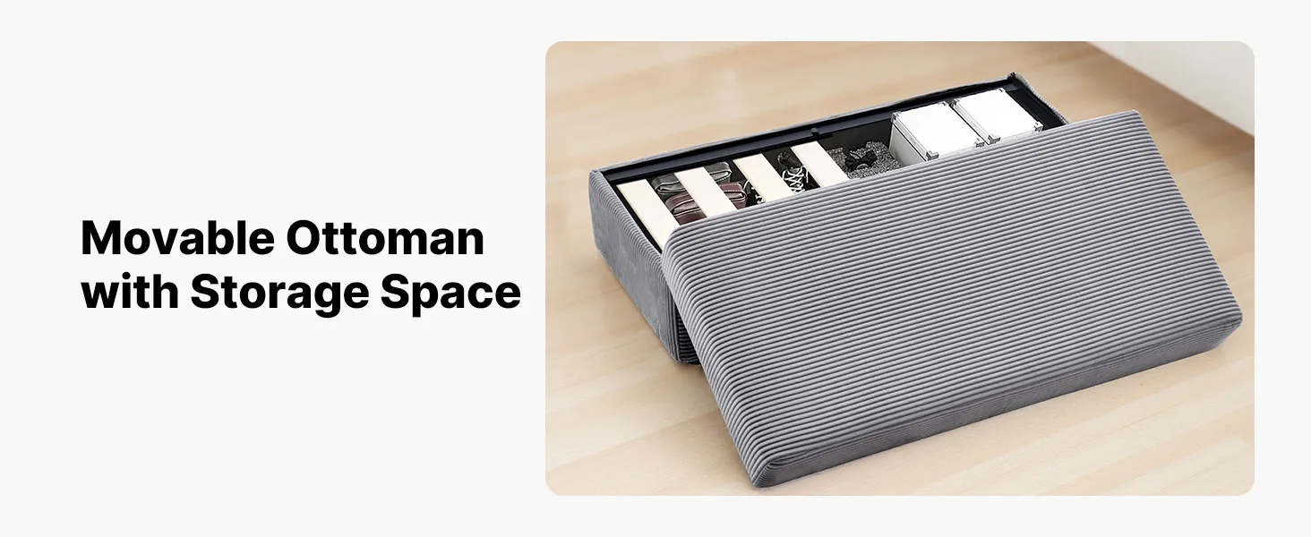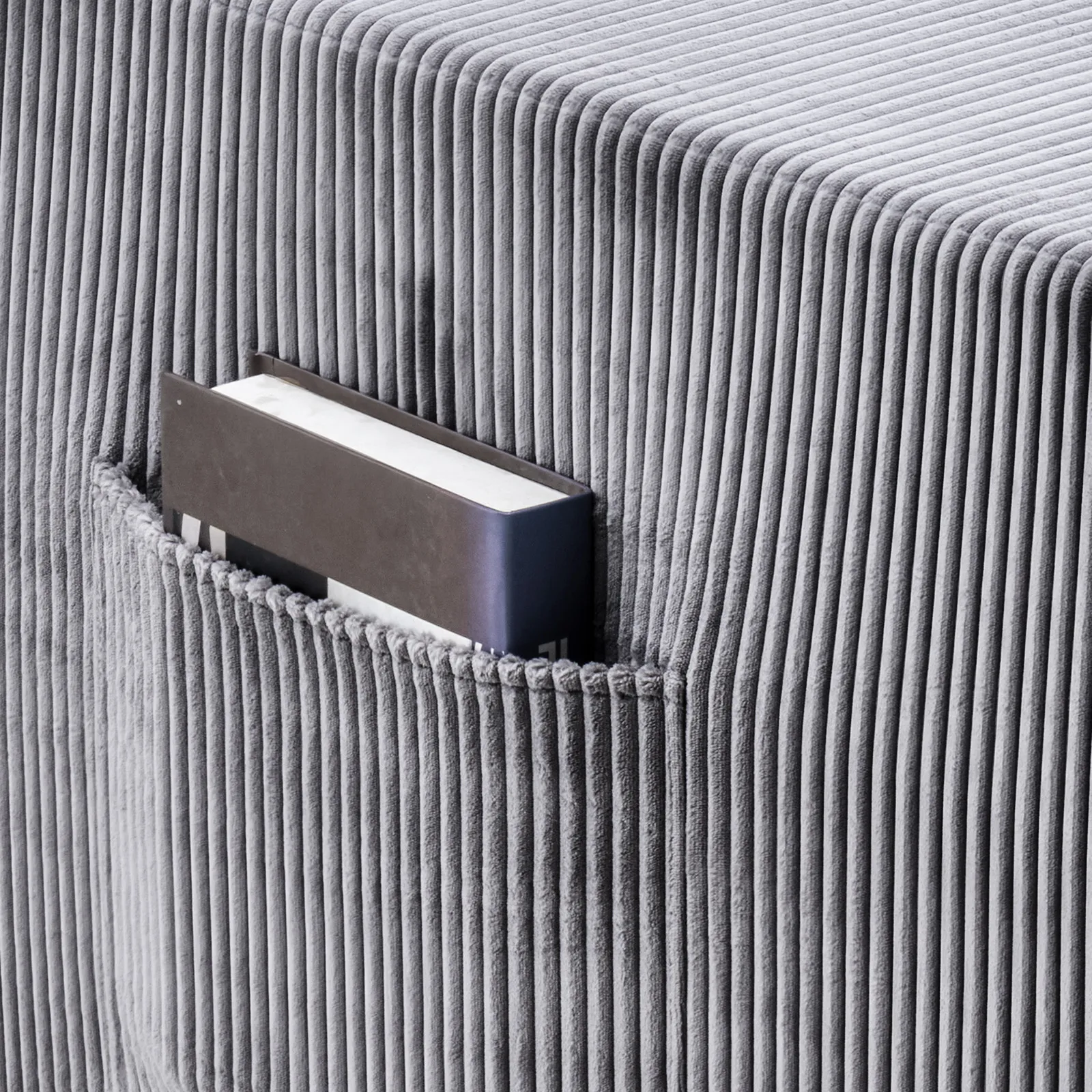 Prémiové čalúnenie je jemné na dotyk, zatiaľ čo pohyblivý úložný otoman a praktické bočné vrecká umocnia váš zážitok z leňošenia.