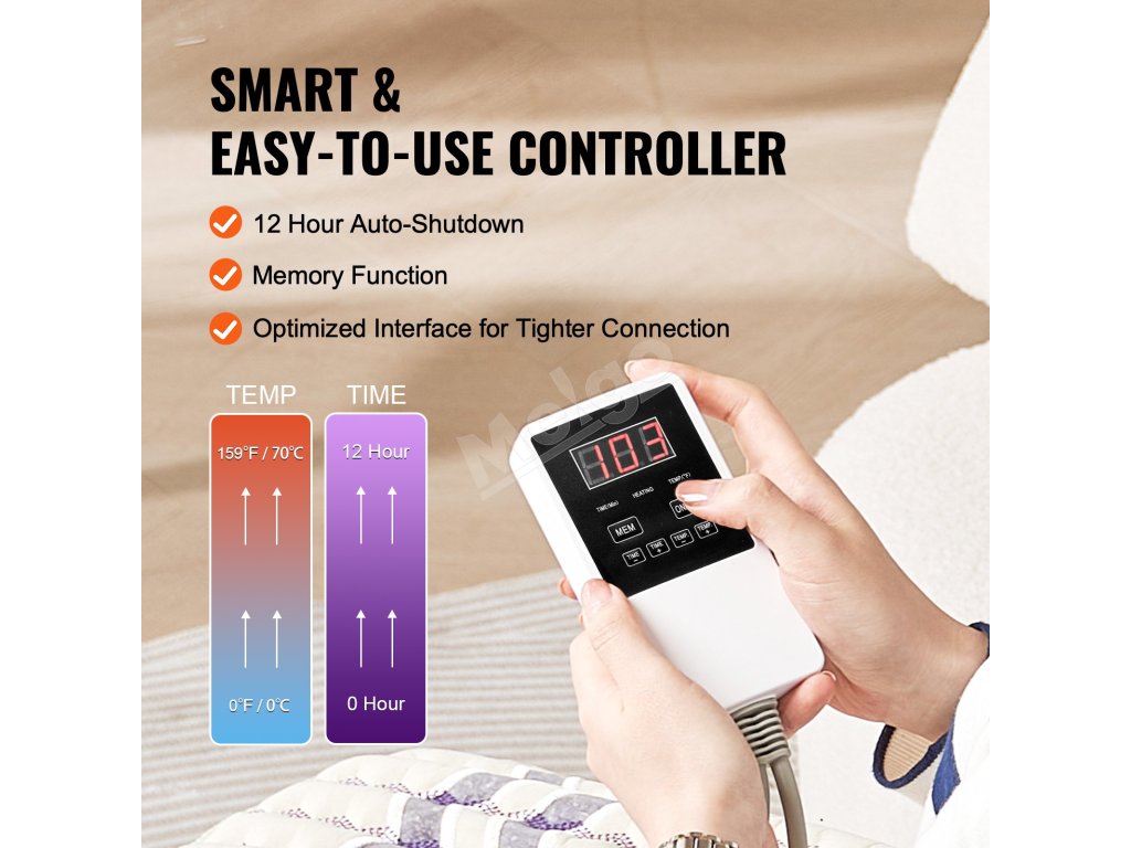Pomocou inteligentného ovládača si môžete nastaviť teplotu od 103°F do 159°F. Je vybavená aj pamäťovou funkciou, ktorá si pamätá vaše posledné nastavenia, časovačom s nastavením 0 - 12 hodín spolu s funkciou automatického vypnutia, ktorá zabraňuje nadmernému používaniu a zaručuje, že ju nikdy nezabudnete vypnúť.