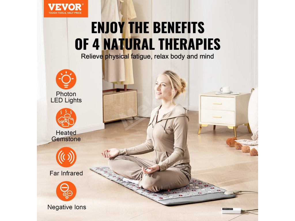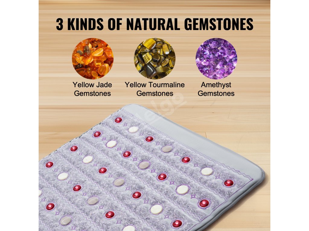 Pocíťte upokojujúce teplo, ktoré zmierňuje stres a uvoľňuje telo. Naša 60" x 24" ametystová vyhrievacia poduška kombinuje 3 prírodné drahokamy, ktoré spájajú 660 nm fotónové červené svetlo, horúce drahokamy, ďaleké infračervené lúče a záporné ióny, ktoré prenikajú hlboko do svalov, zmierňujú bolesť tela a podporujú krvný obeh.