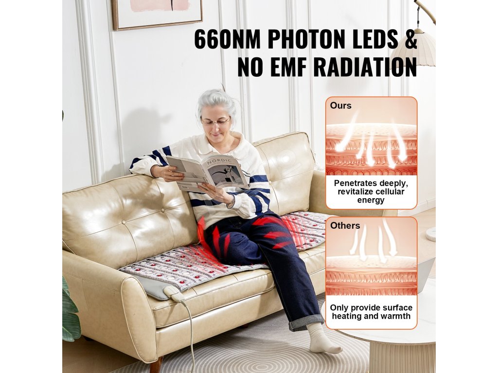 S využitím 660nm fotónového červeného svetla a ďalekých infračervených lúčov preniká táto vyhrievacia podložka z prírodných drahých kameňov hlboko do svalových vrstiev, čím zmierňuje bolesť a únavu, podporuje uvoľnenie celého tela a poskytuje hlbší terapeutický účinok pre maximálne pohodlie.
