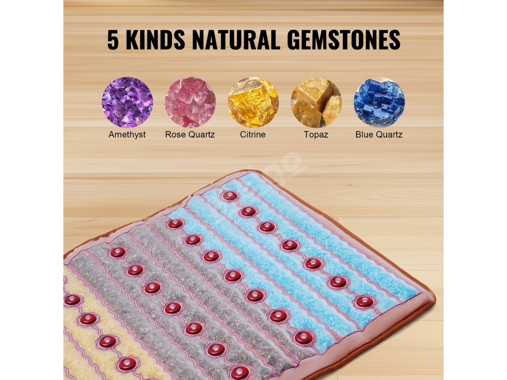 Pocíťte upokojujúce teplo, ktoré zmierňuje stres a uvoľňuje telo. Naša 40" x 20" ametystová vyhrievacia podložka kombinuje 5 prírodných drahých kameňov, ktoré spájajú 660 nm fotónové červené svetlo, horúce drahé kamene, ďaleké infračervené lúče a záporné ióny, ktoré prenikajú hlboko do svalov, zmierňujú bolesť tela a podporujú krvný obeh.